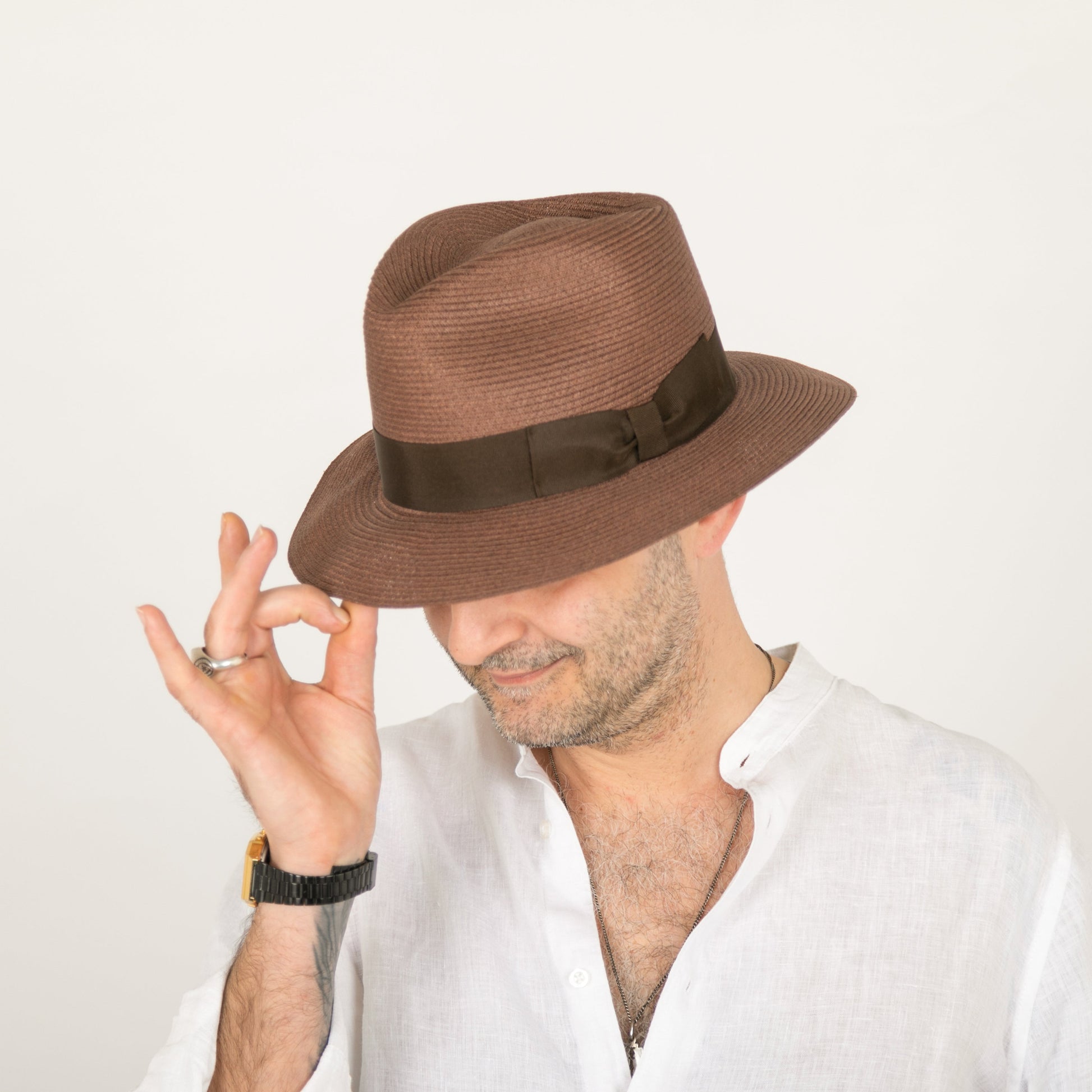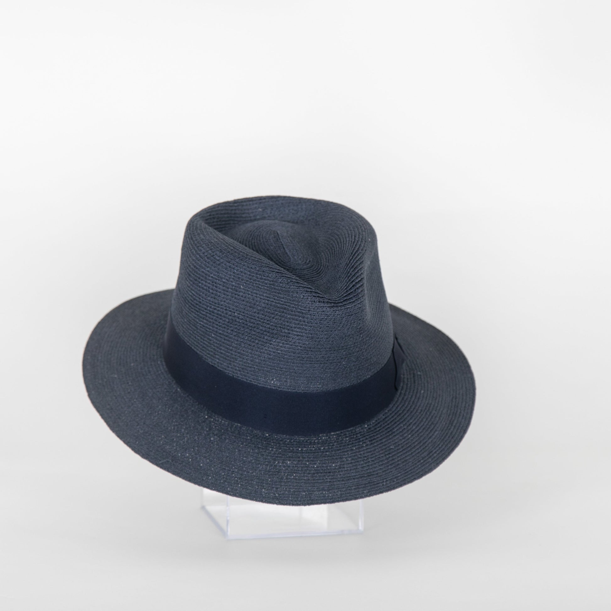 Classic Western Fedora model in fine hemp. Made of sewn hemp braid. Wide brim, blue gros-grain band decoration. Lightweight and breathable Casual style. Also available in brown, with tone-on-tone gros-grain, sizes 55 to 61.