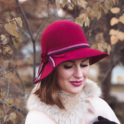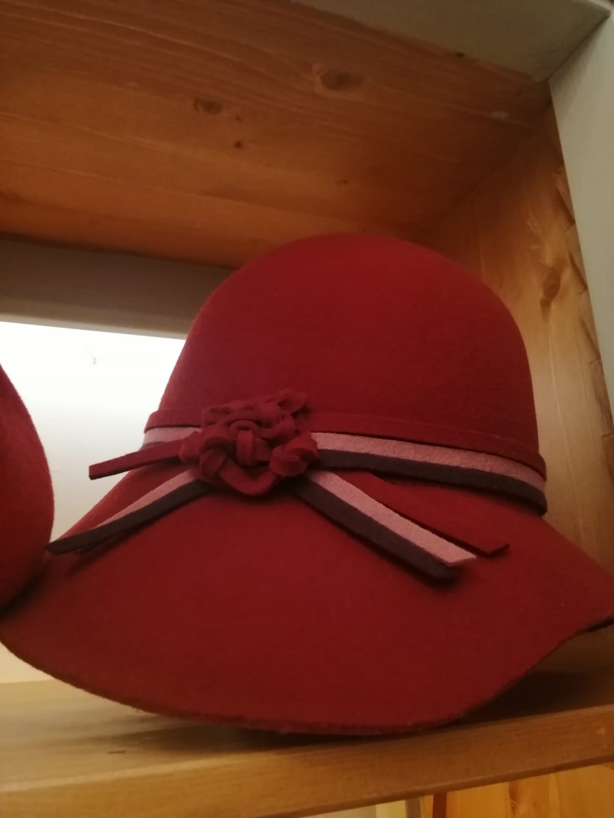 Design: A fanciful wide-brimmed cloche with a round crown sloping from the sides. The hat is embellished with a double felt cord in two colors that ends in a small flower of the same color as the hat.