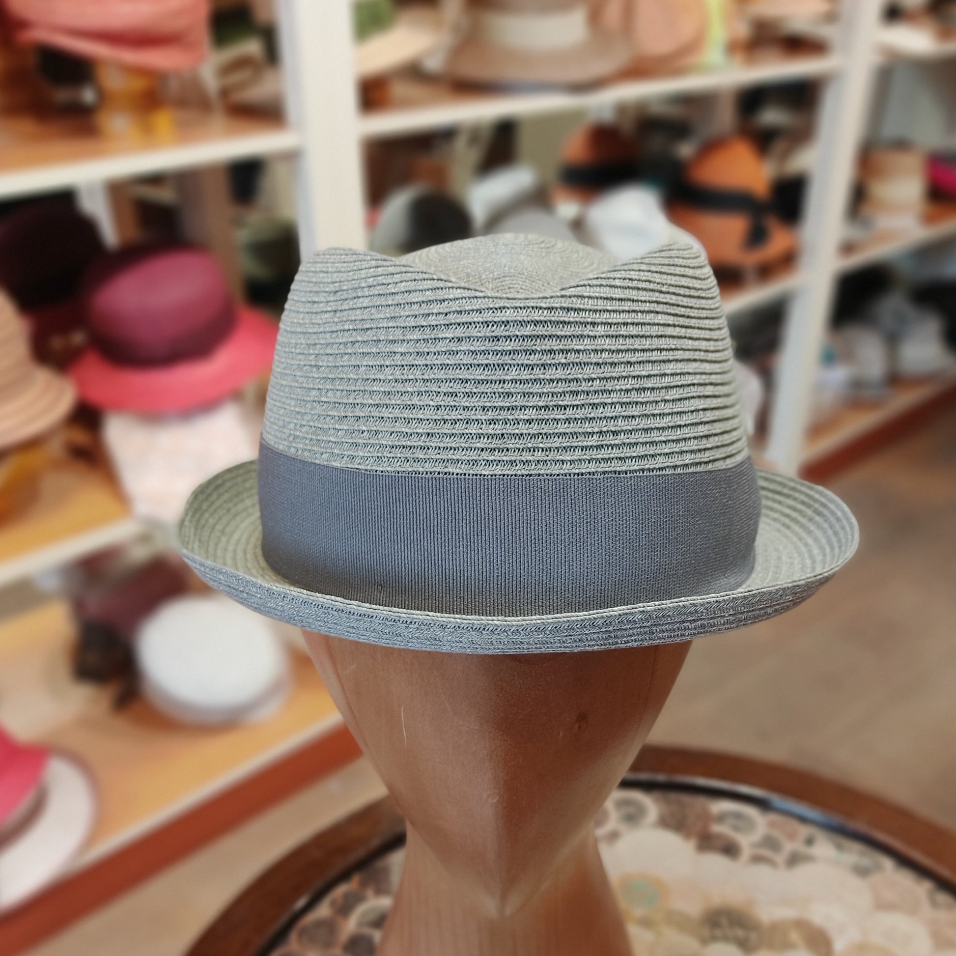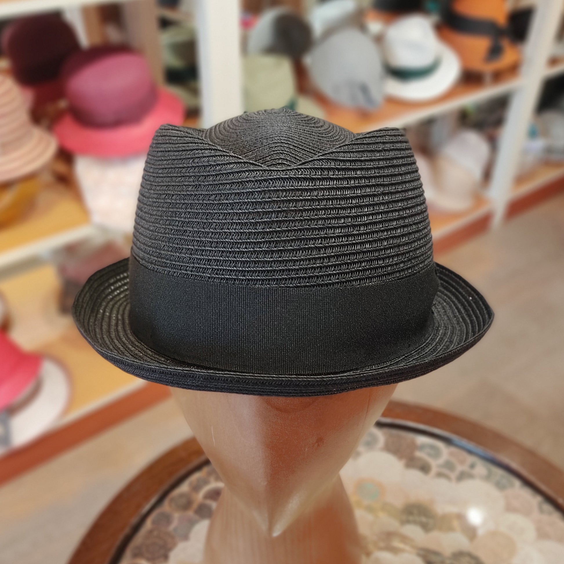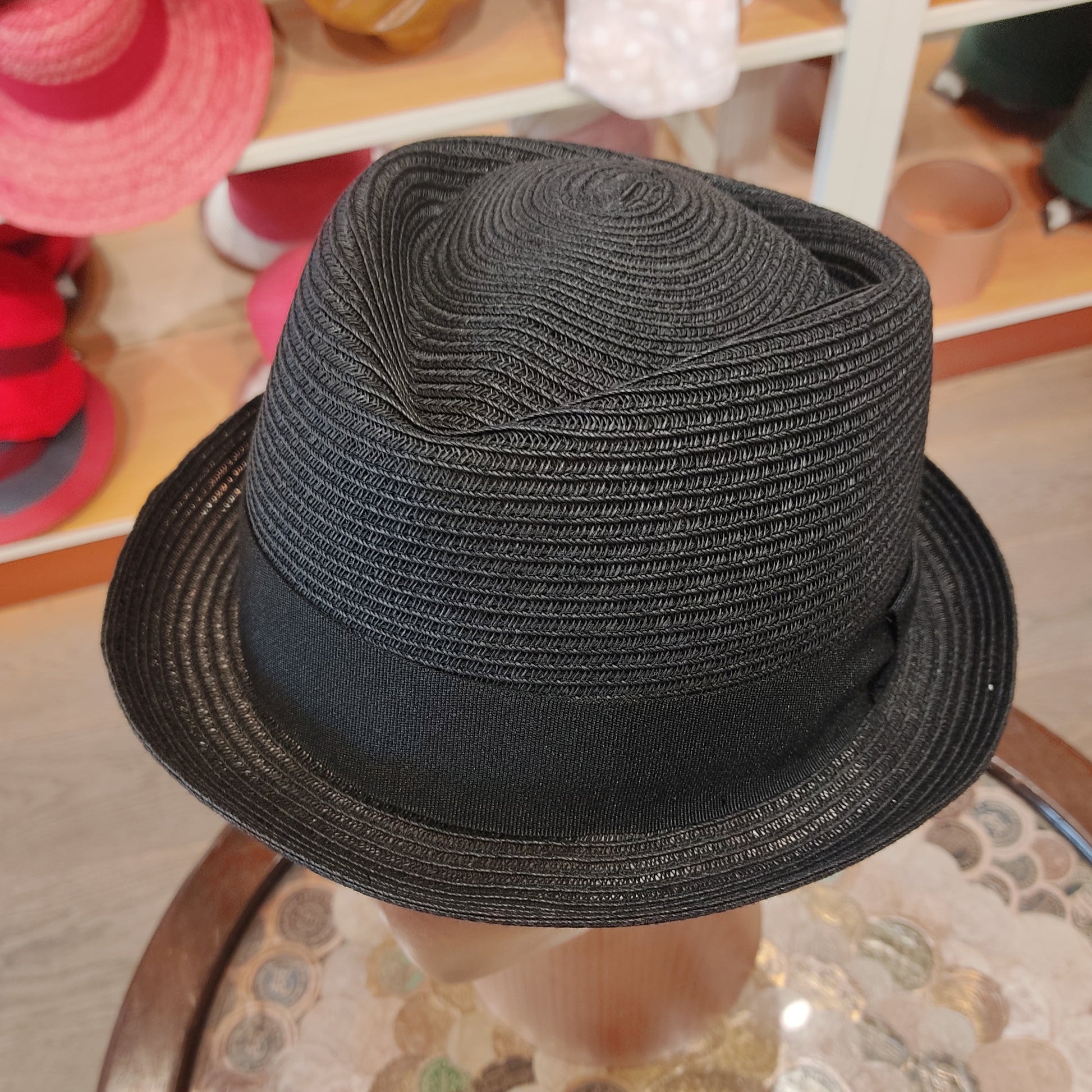 Pork pie braid model. Made of textile paper braid. Narrow brim typical of pork pie, diamond-shaped crown. Lightweight hat suitable for casual summer style. Tone-on-tone gros-grain decoration band. Available in blue and black. Sizes from 55 to 61
