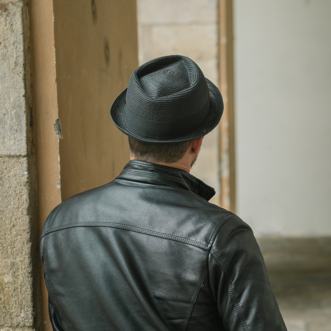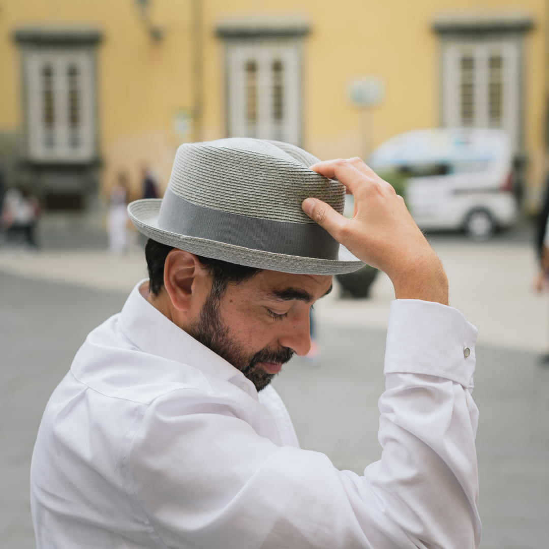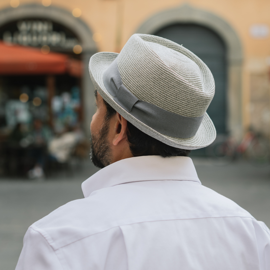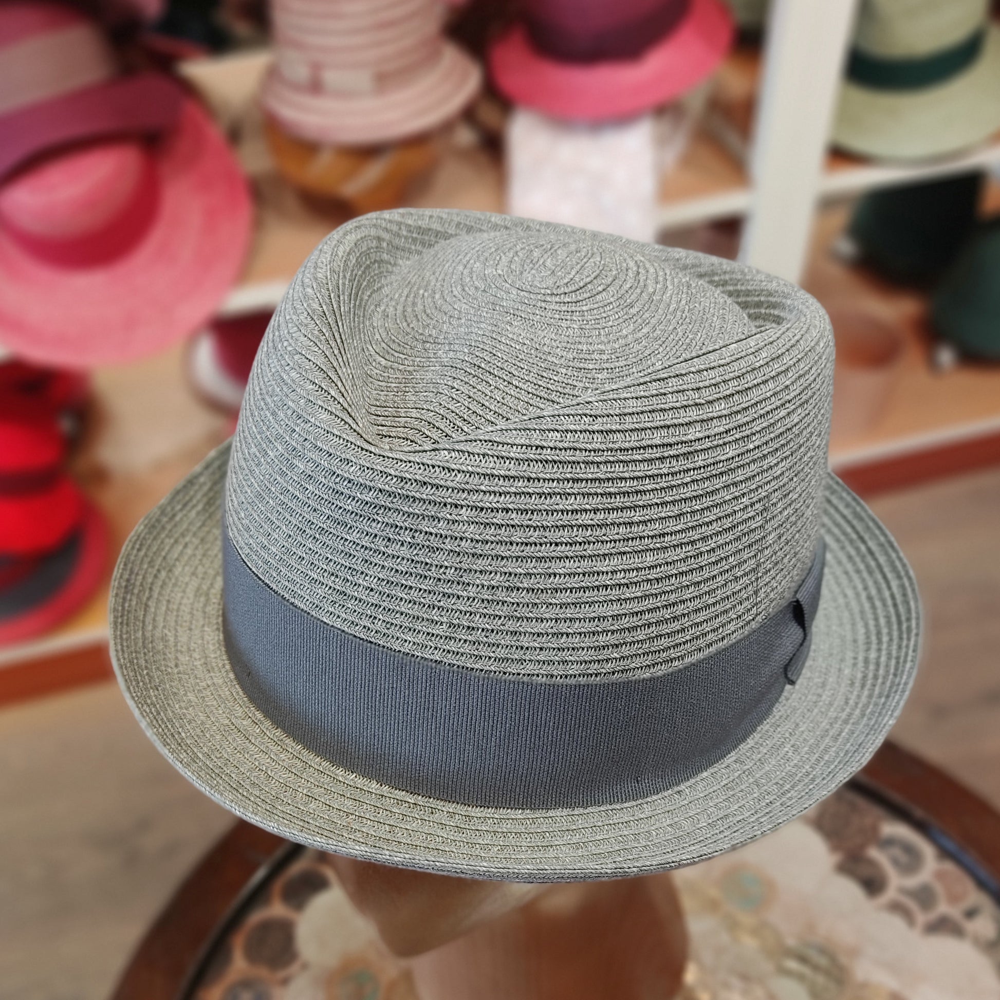 Pork pie braid model. Made of textile paper braid. Narrow brim typical of pork pie, diamond-shaped crown. Lightweight hat suitable for casual summer style. Tone-on-tone gros-grain decoration band. Available in blue and black. Sizes from 55 to 61