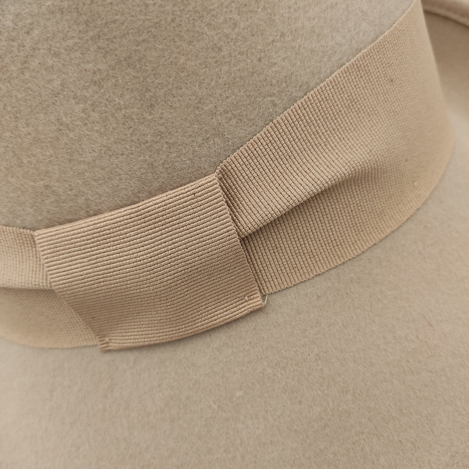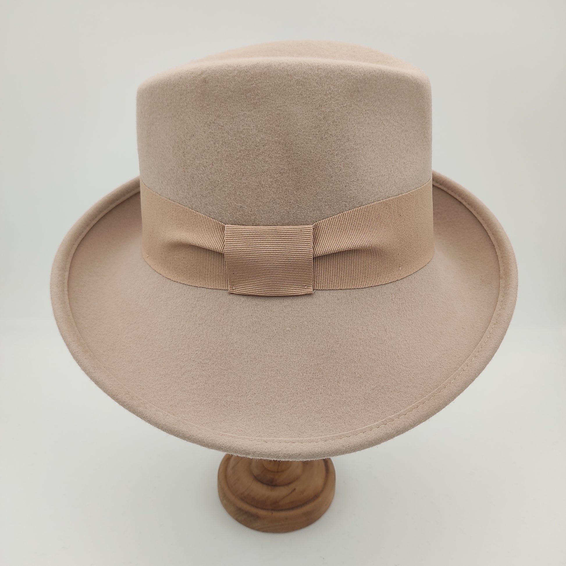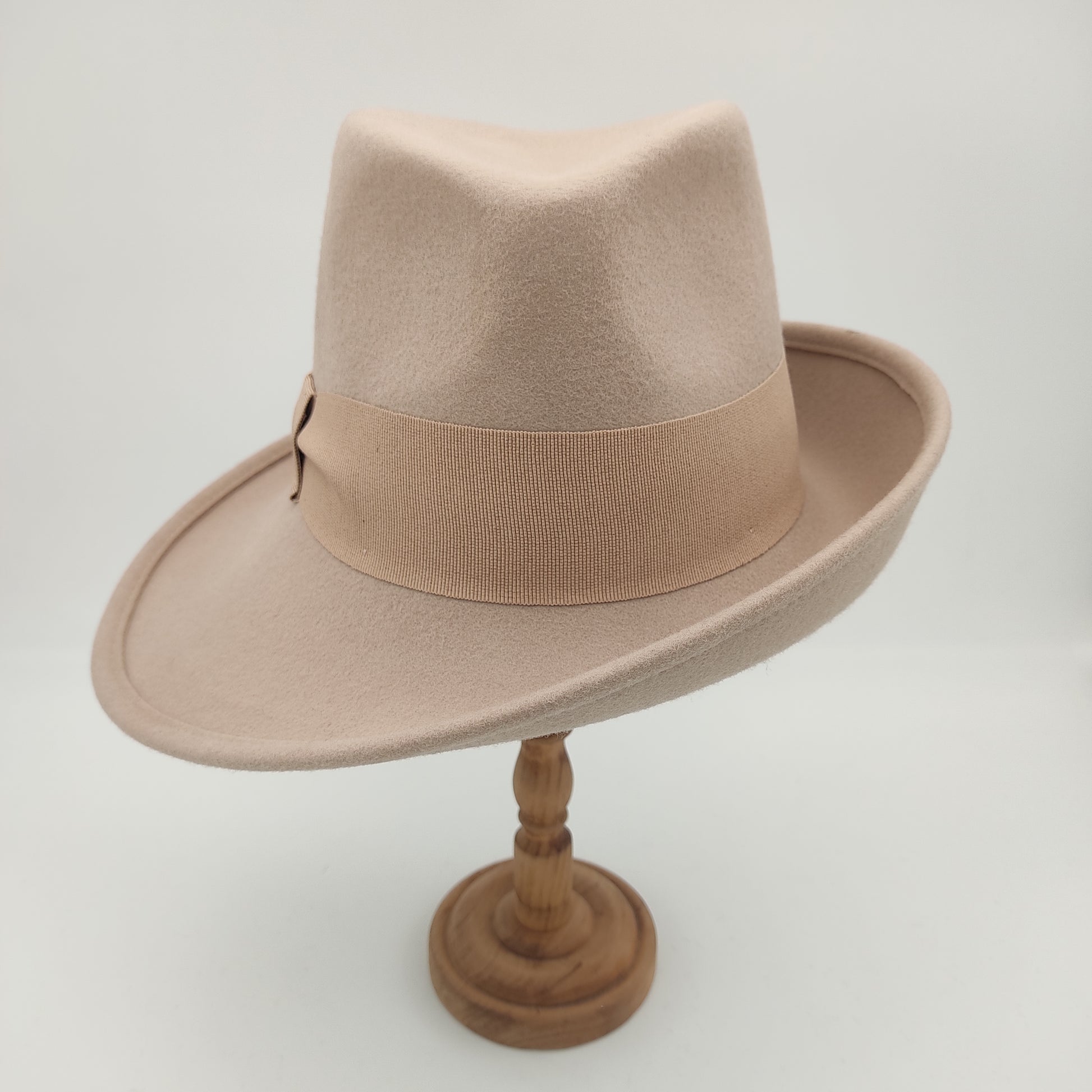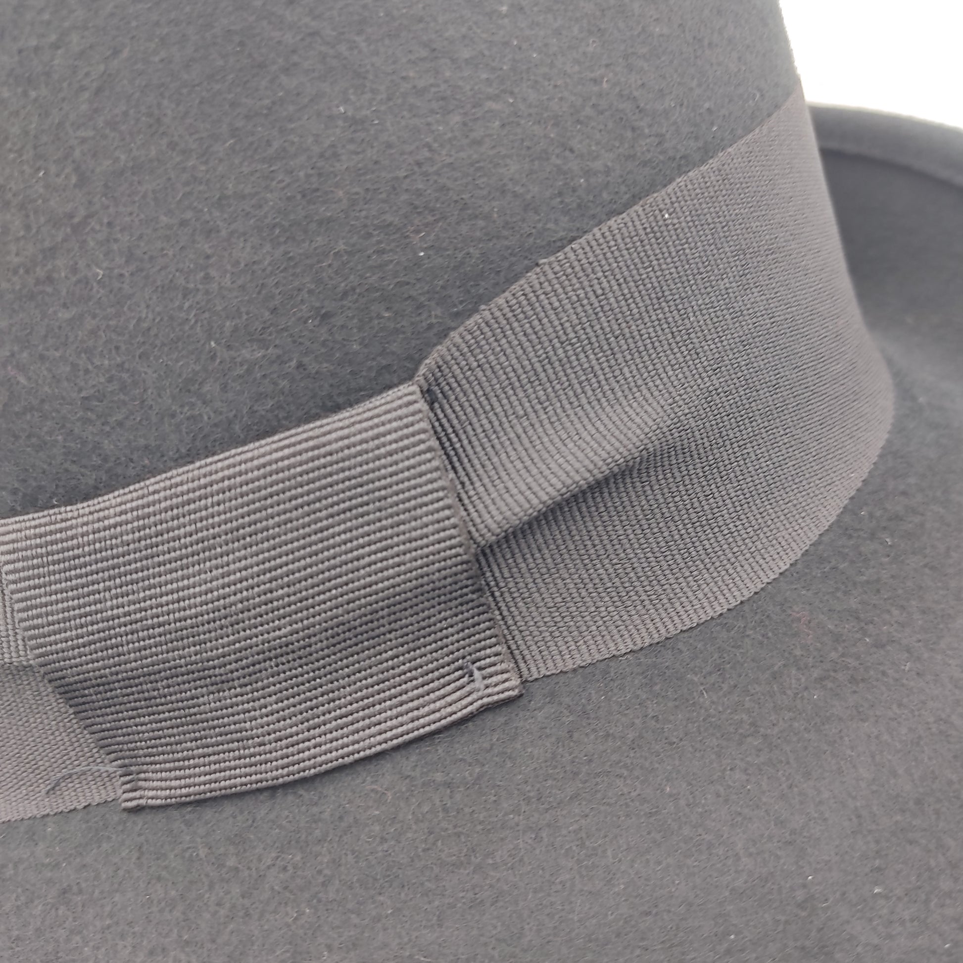 Il cappello è realizzato in feltro di lana e presenta una testa di taglio maschile alta 10 cm, mentre la falda asimmetrica che arriva ad un'ampiezza di 10 cm è il dettaglio che rende questo cappello molto raffinato e femminile.