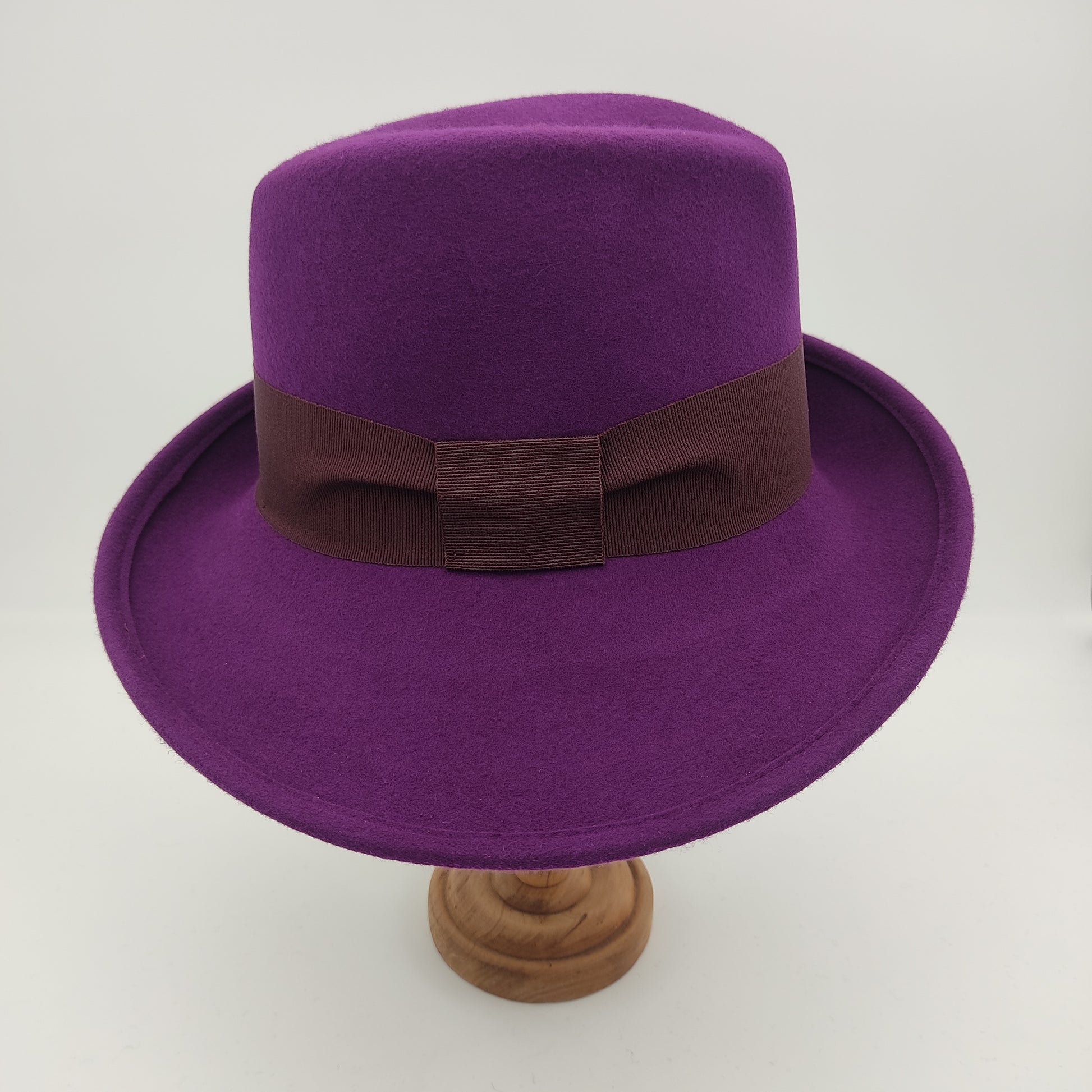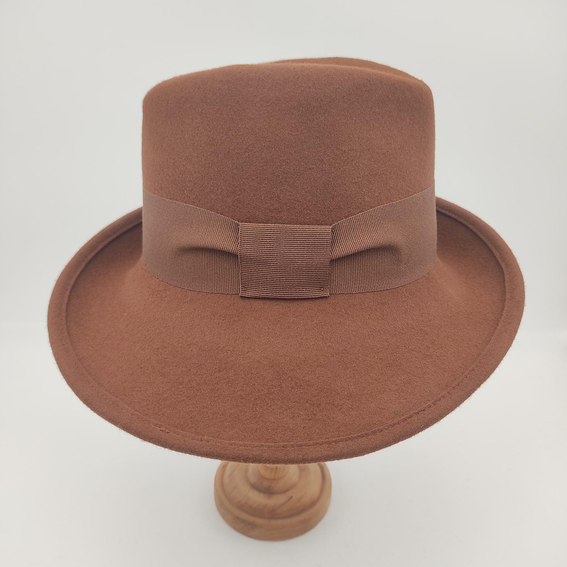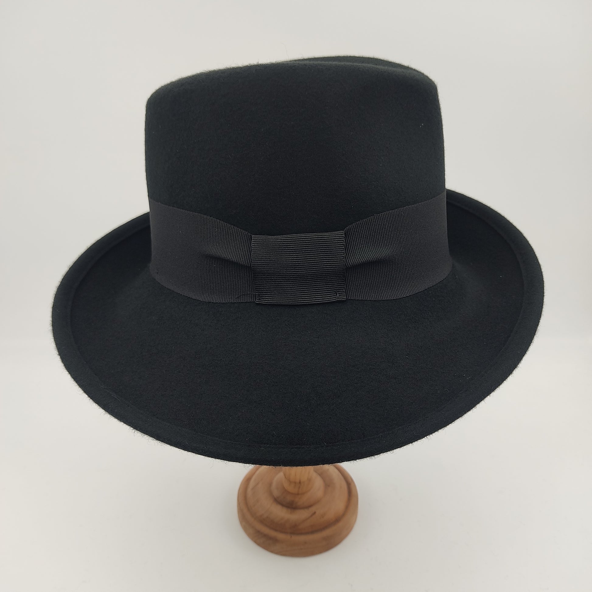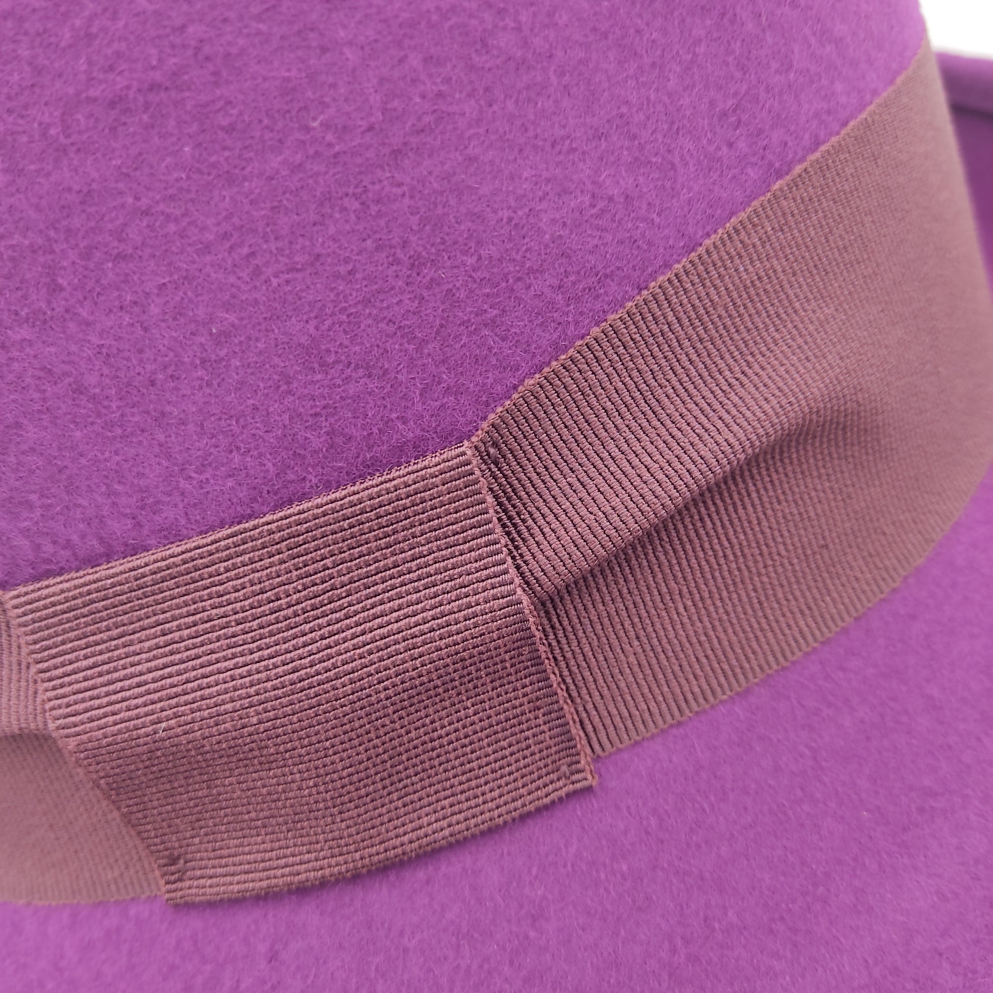 Il cappello è realizzato in feltro di lana e presenta una testa di taglio maschile alta 10 cm, mentre la falda asimmetrica che arriva ad un'ampiezza di 10 cm è il dettaglio che rende questo cappello molto raffinato e femminile.