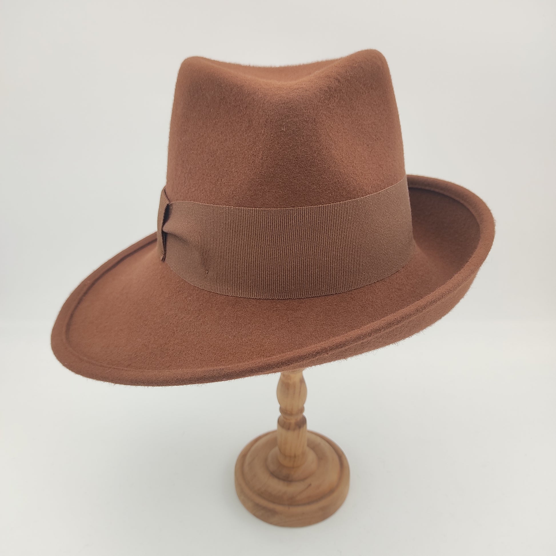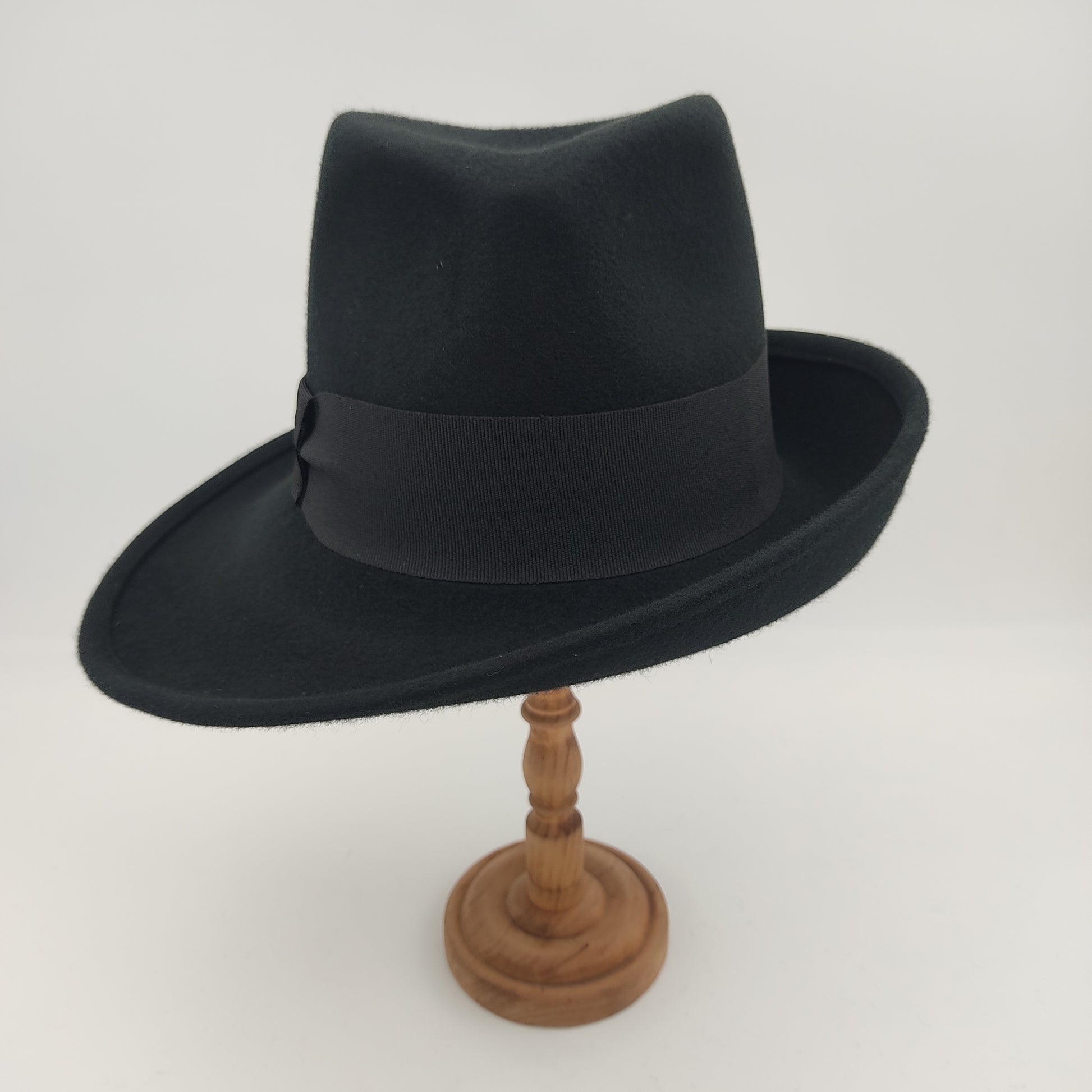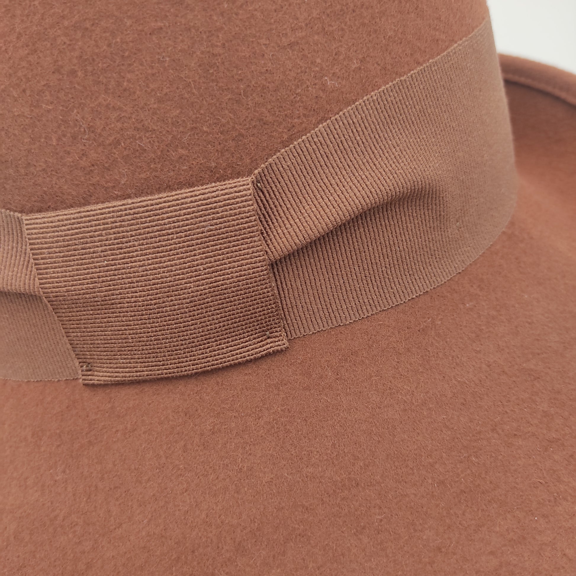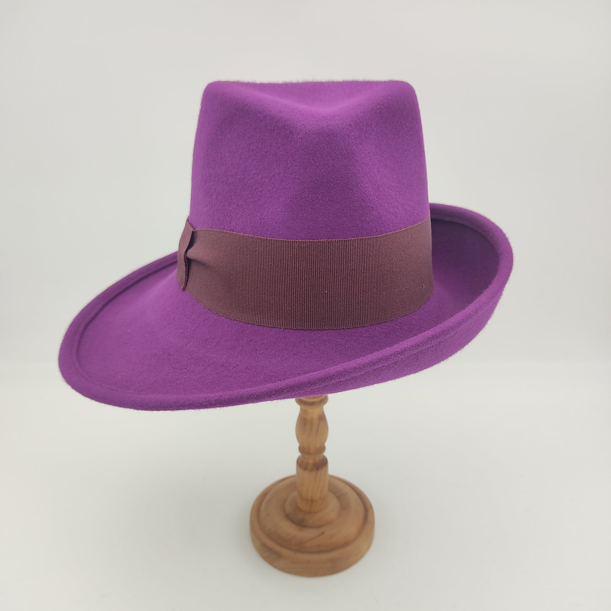 Il cappello è realizzato in feltro di lana e presenta una testa di taglio maschile alta 10 cm, mentre la falda asimmetrica che arriva ad un'ampiezza di 10 cm è il dettaglio che rende questo cappello molto raffinato e femminile.