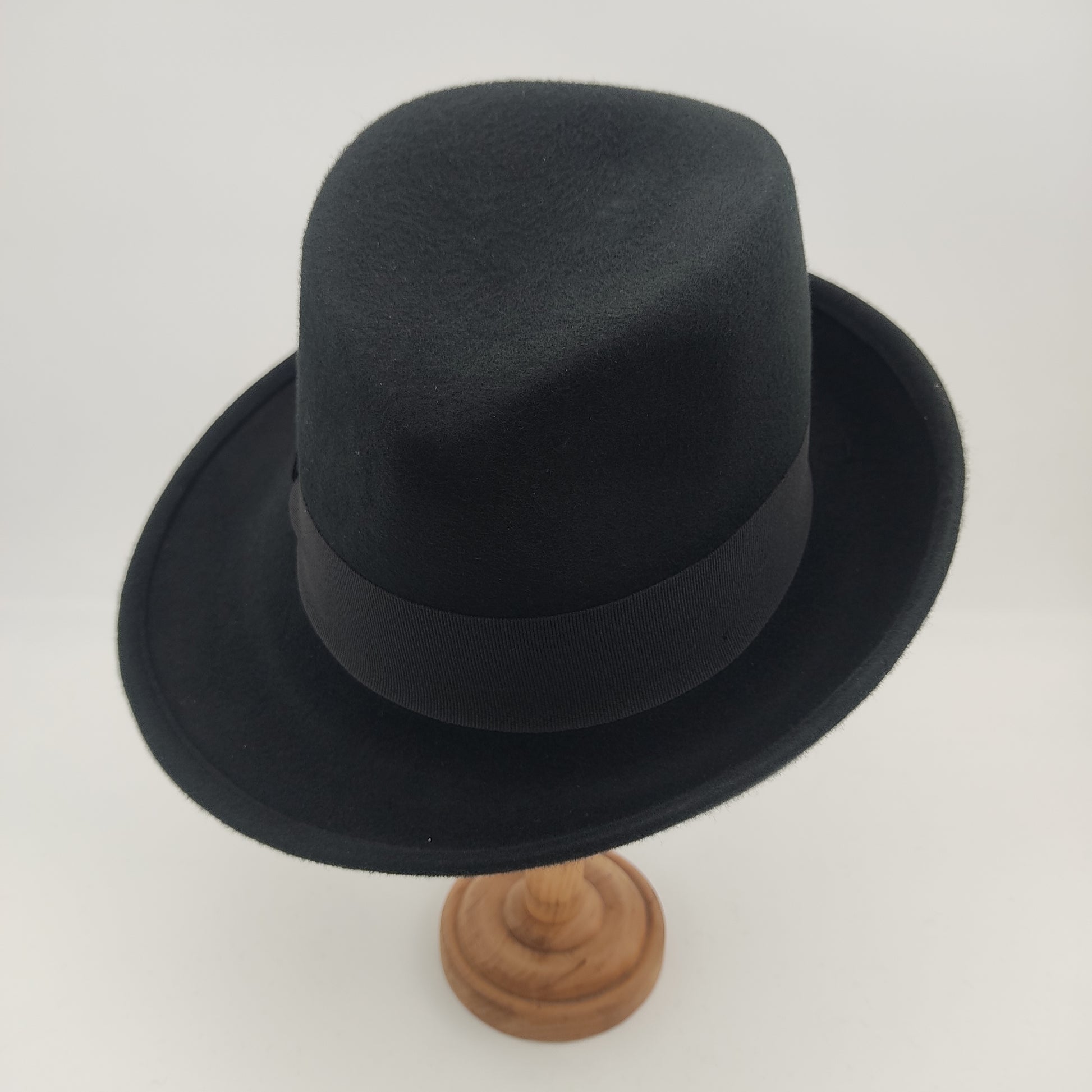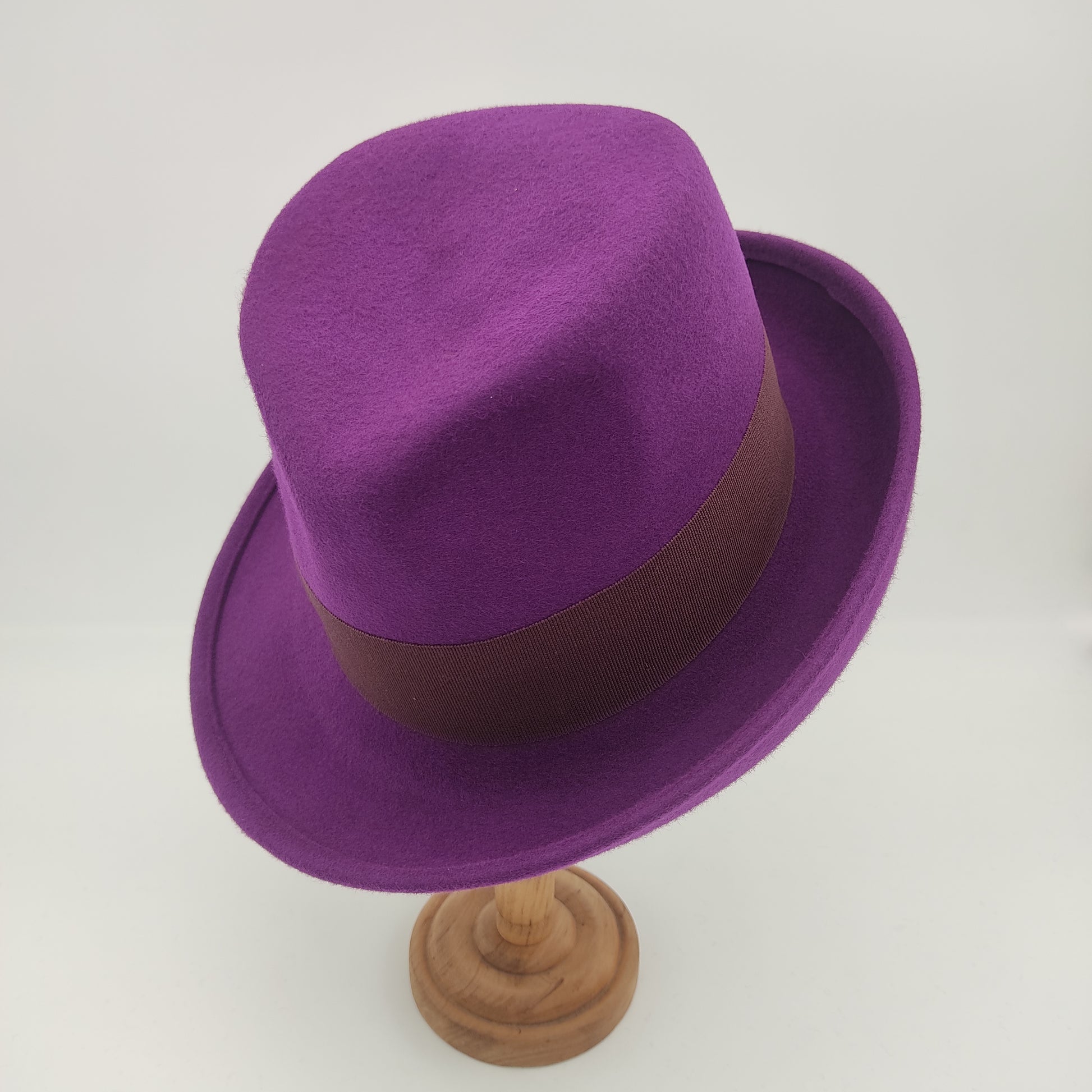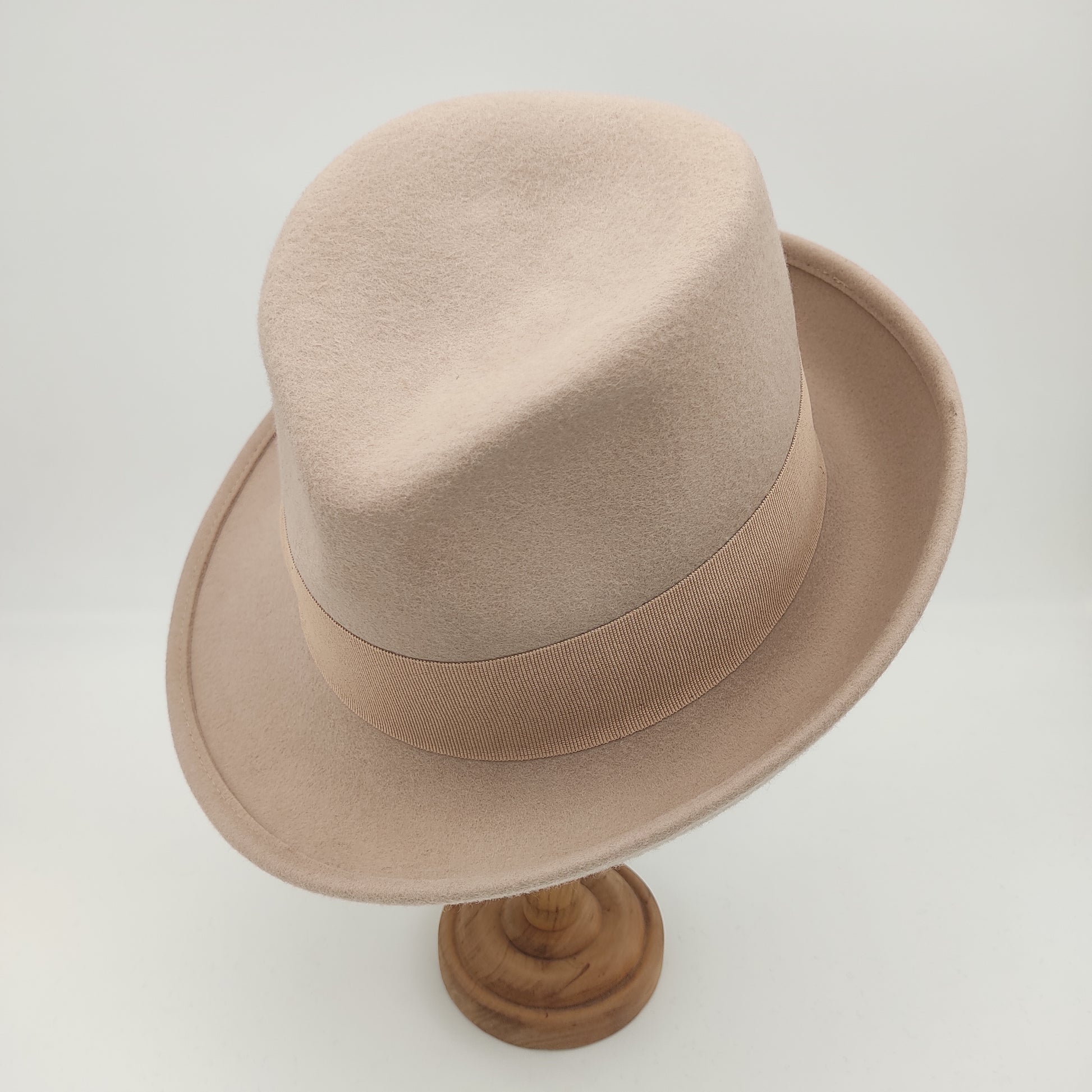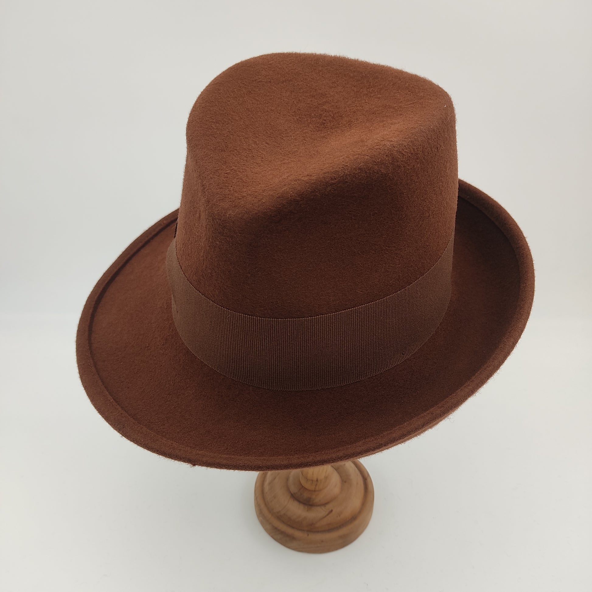 Il cappello è realizzato in feltro di lana e presenta una testa di taglio maschile alta 10 cm, mentre la falda asimmetrica che arriva ad un'ampiezza di 10 cm è il dettaglio che rende questo cappello molto raffinato e femminile.