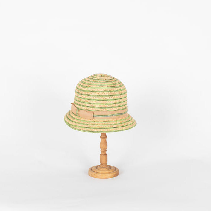 Design: La tesa stretta ha il bordo rialzato. Lo abbiamo impreziosito con una fiocco laterale tono su tono sempre in paglia.