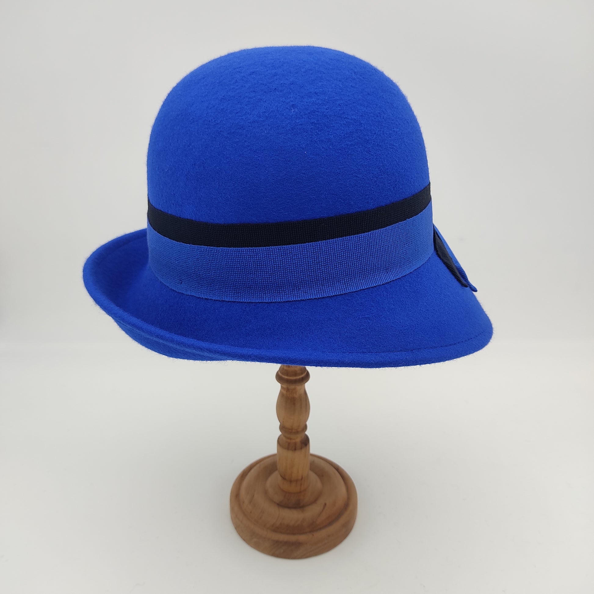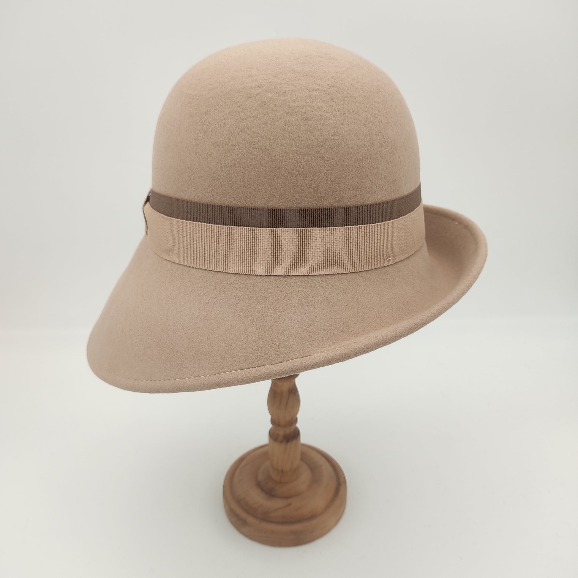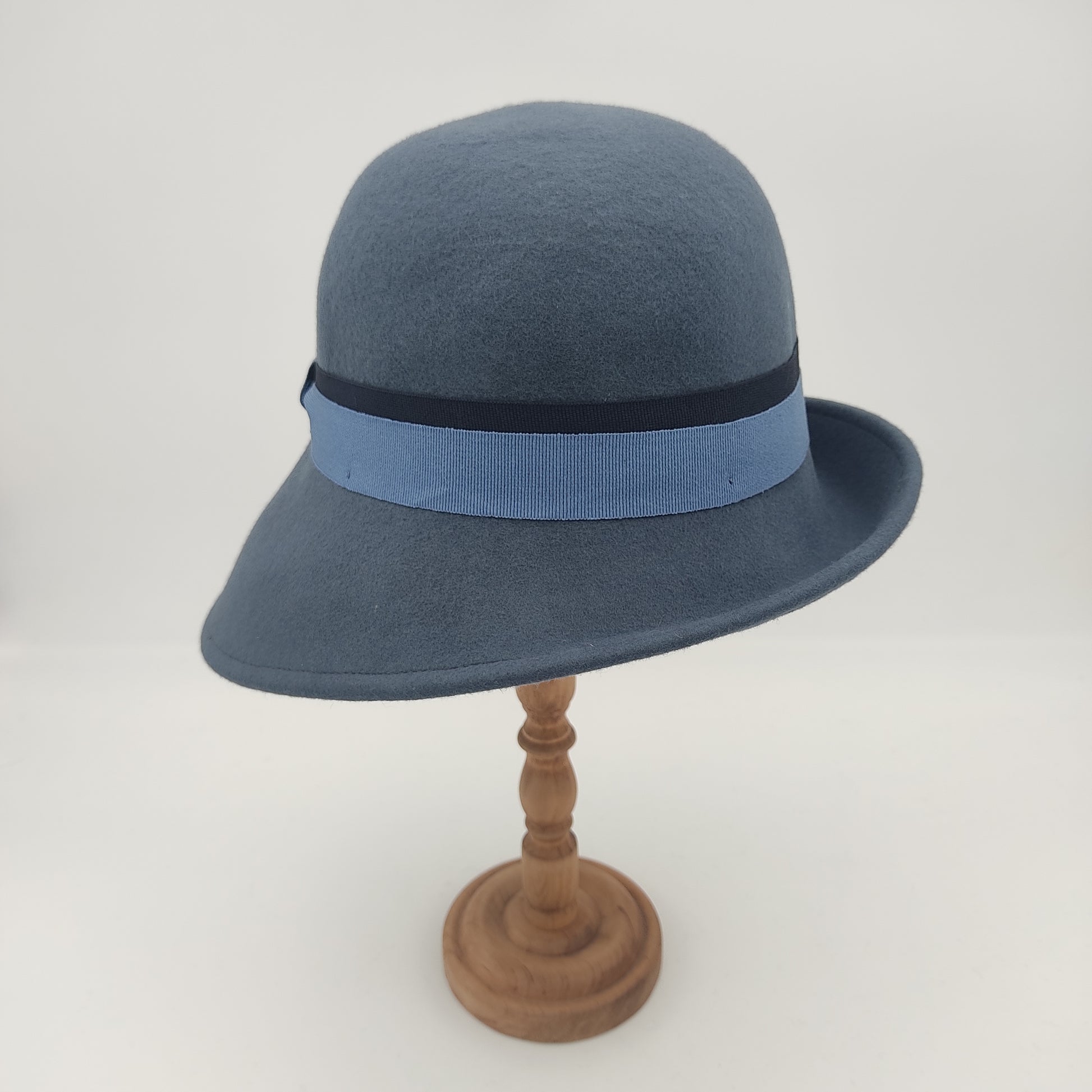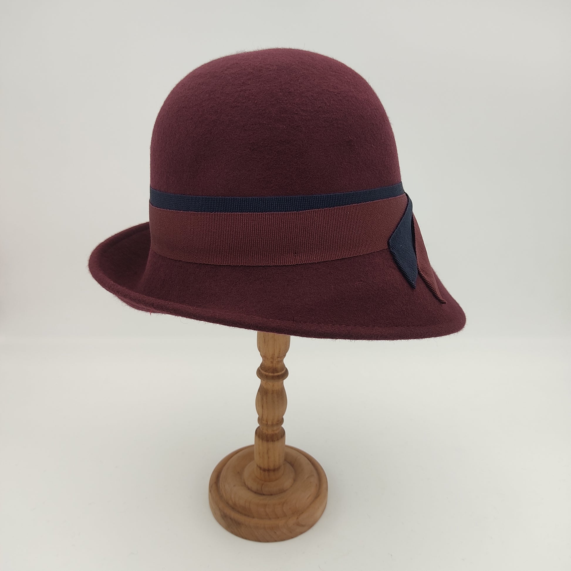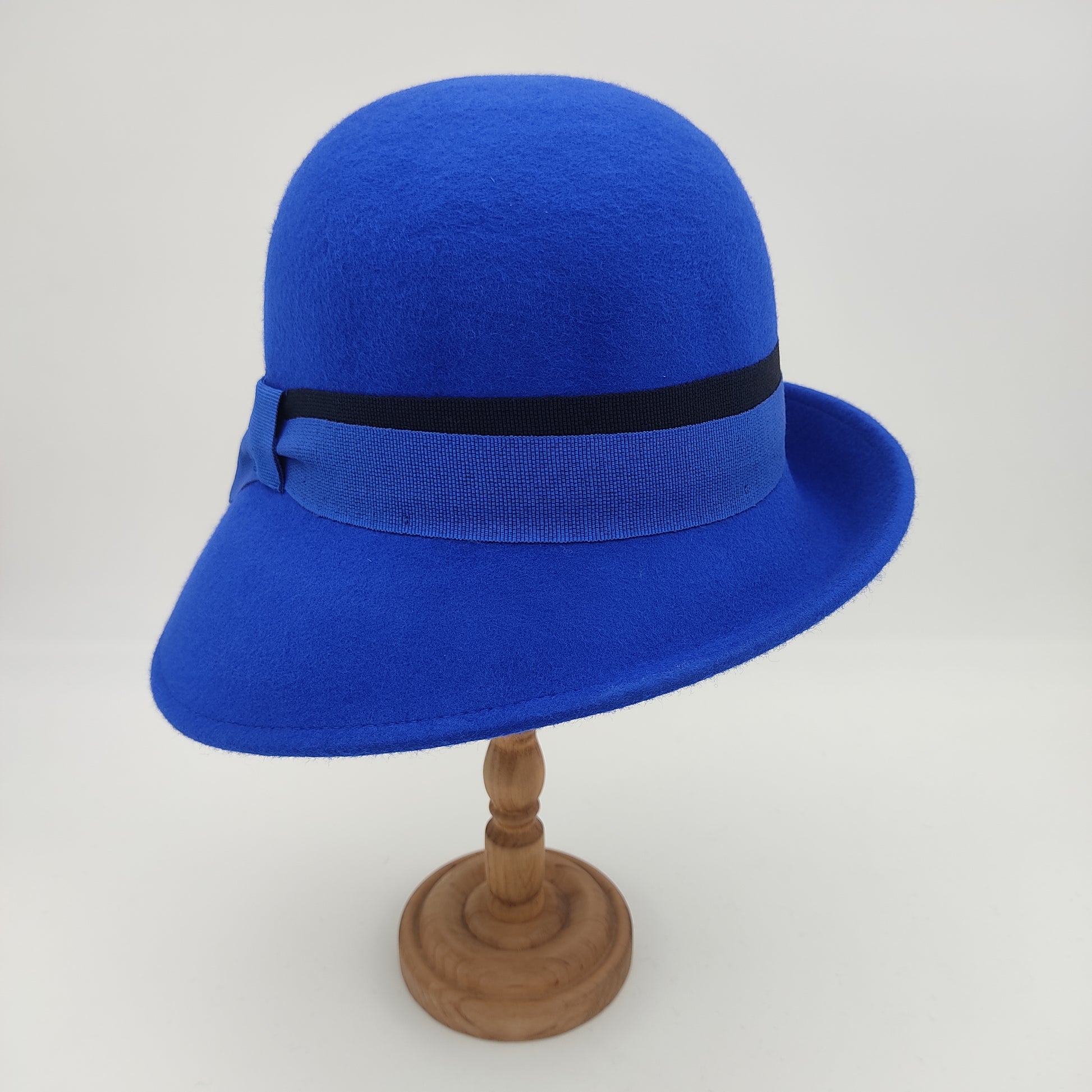 Il cappello Cora è una raffinata cloche asimmetrica per donna dallo stile elegante. Realizzato in Italia con feltro di lana al 100%, questo copricapo si distingue per la sua falda asimmetrica che raggiunge un'ampiezza di 9 cm.