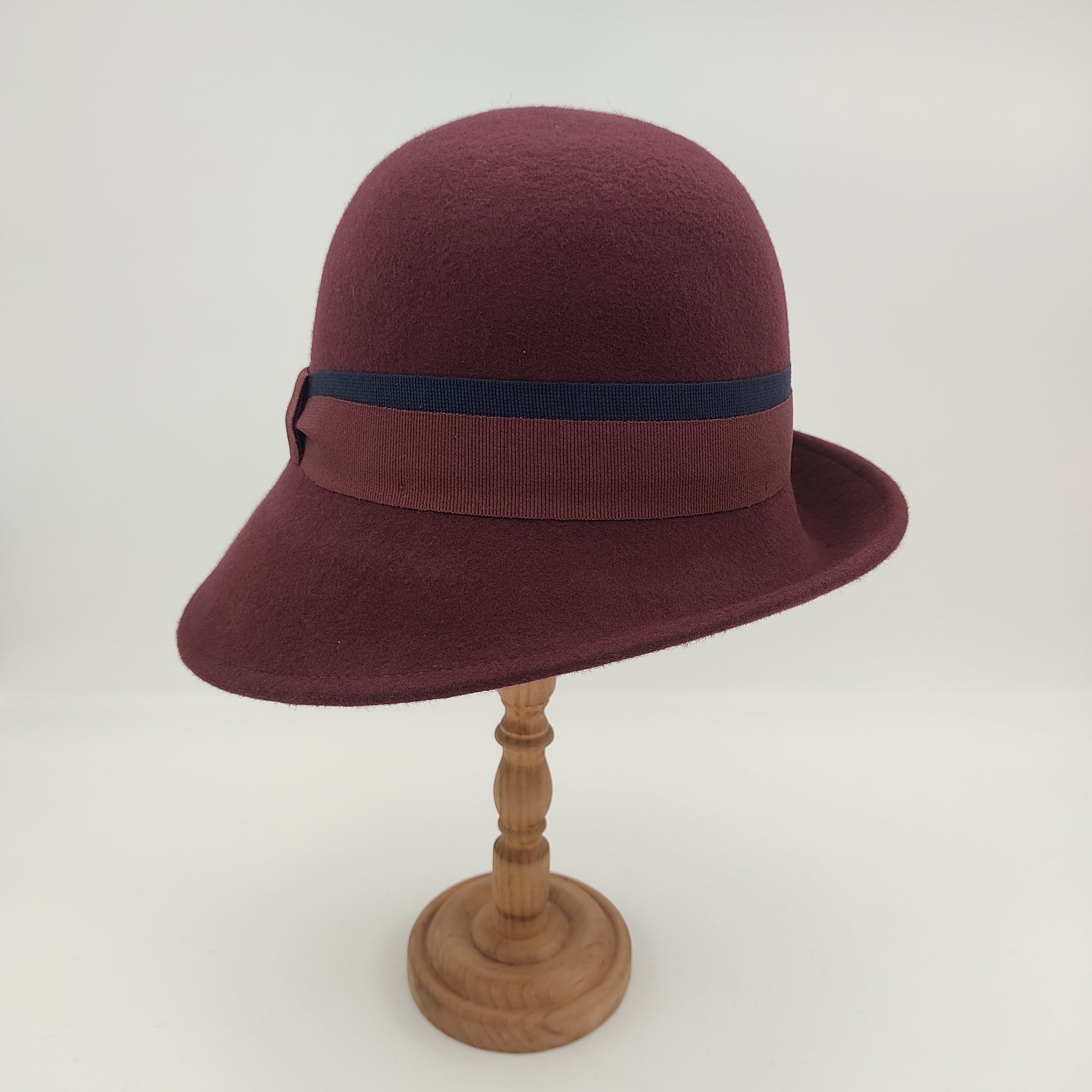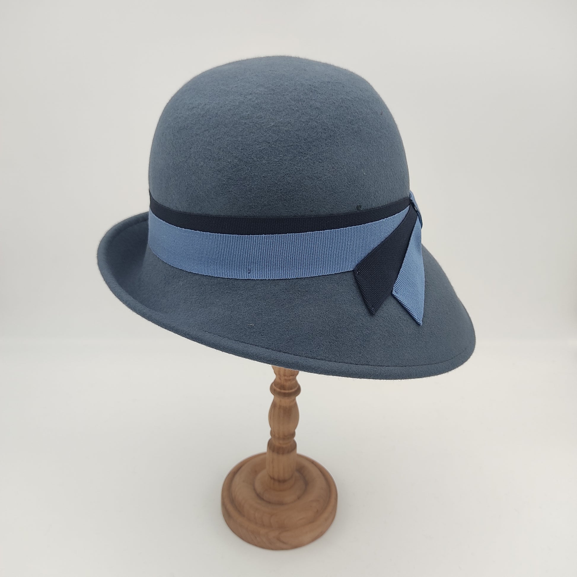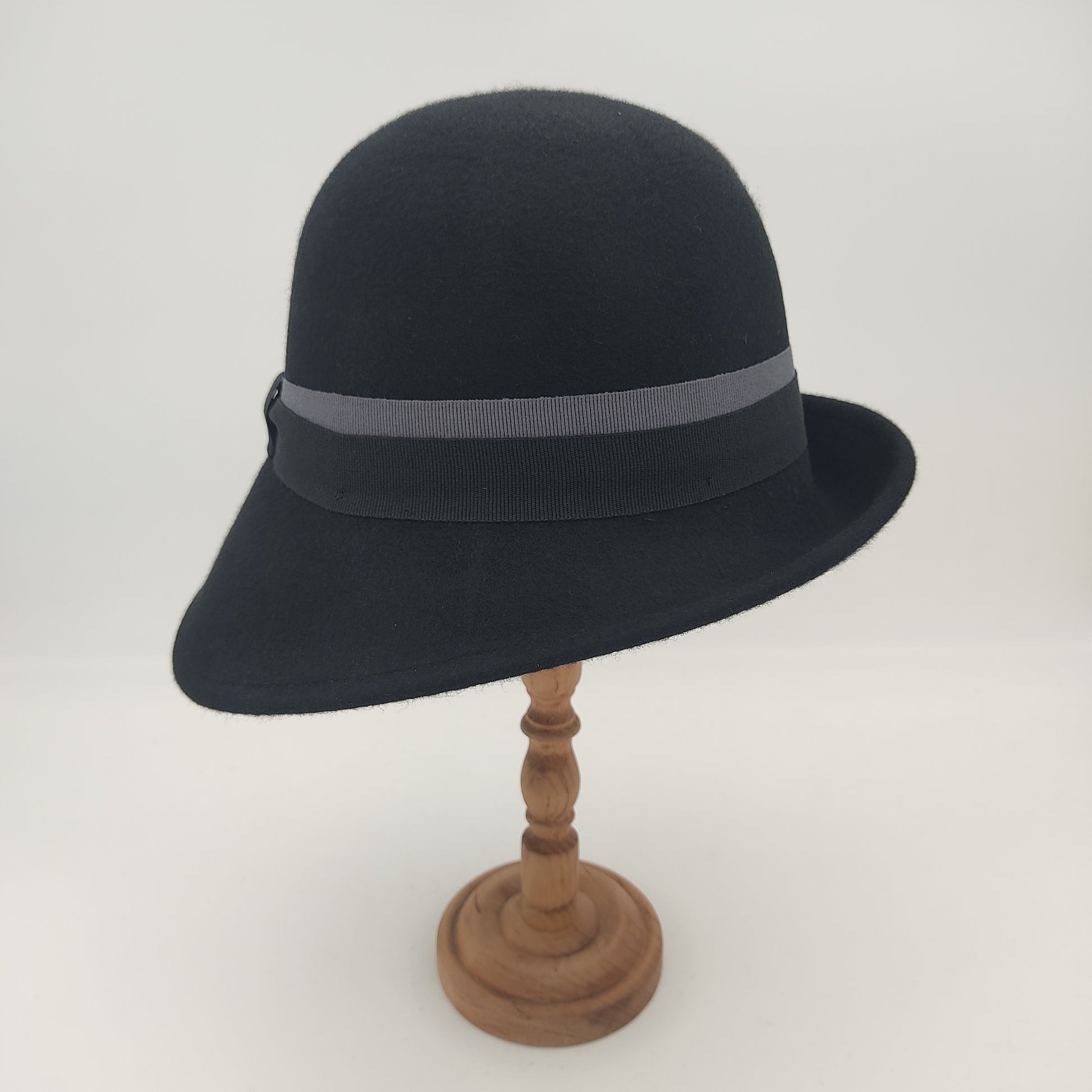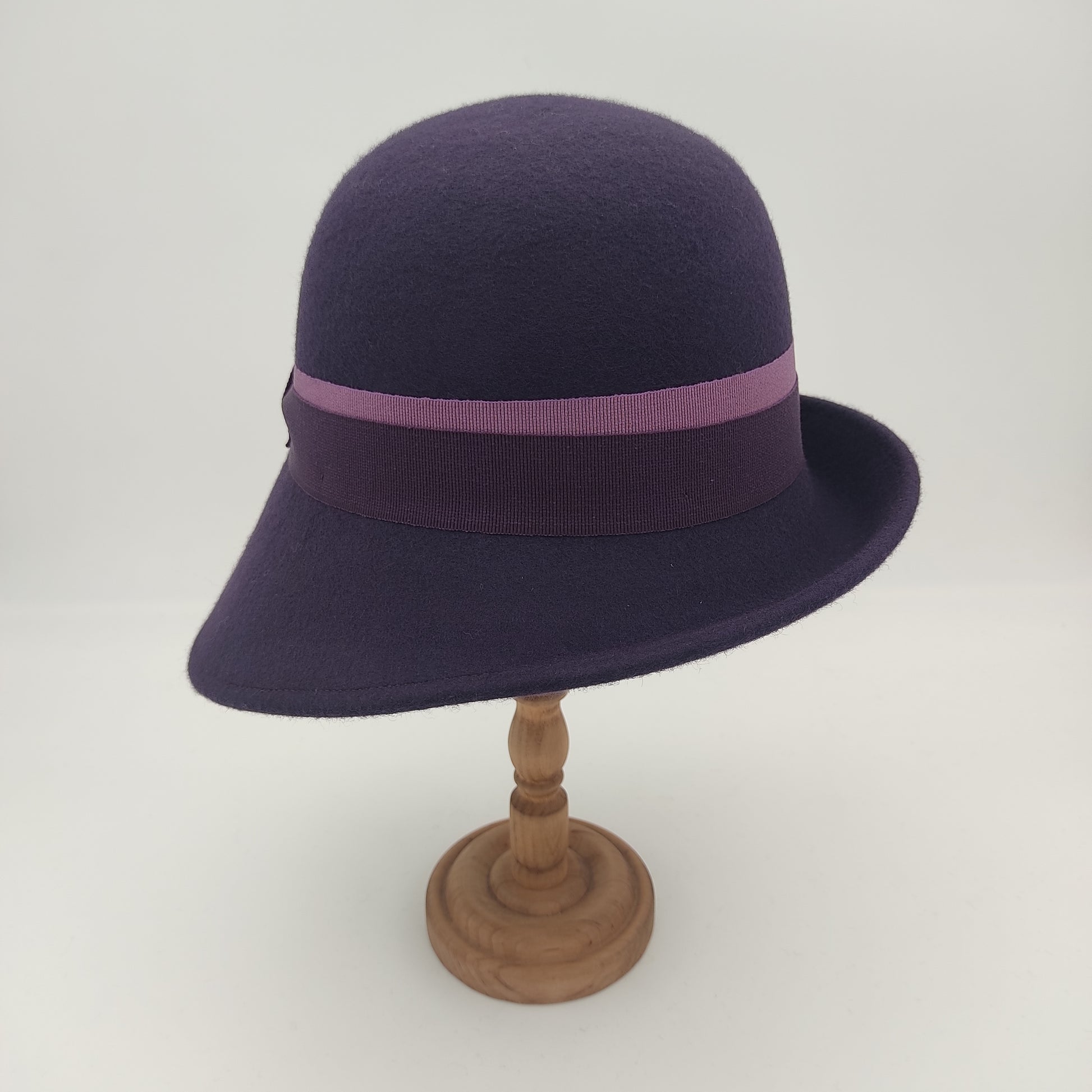 Il cappello Cora è una raffinata cloche asimmetrica per donna dallo stile elegante. Realizzato in Italia con feltro di lana al 100%, questo copricapo si distingue per la sua falda asimmetrica che raggiunge un'ampiezza di 9 cm.