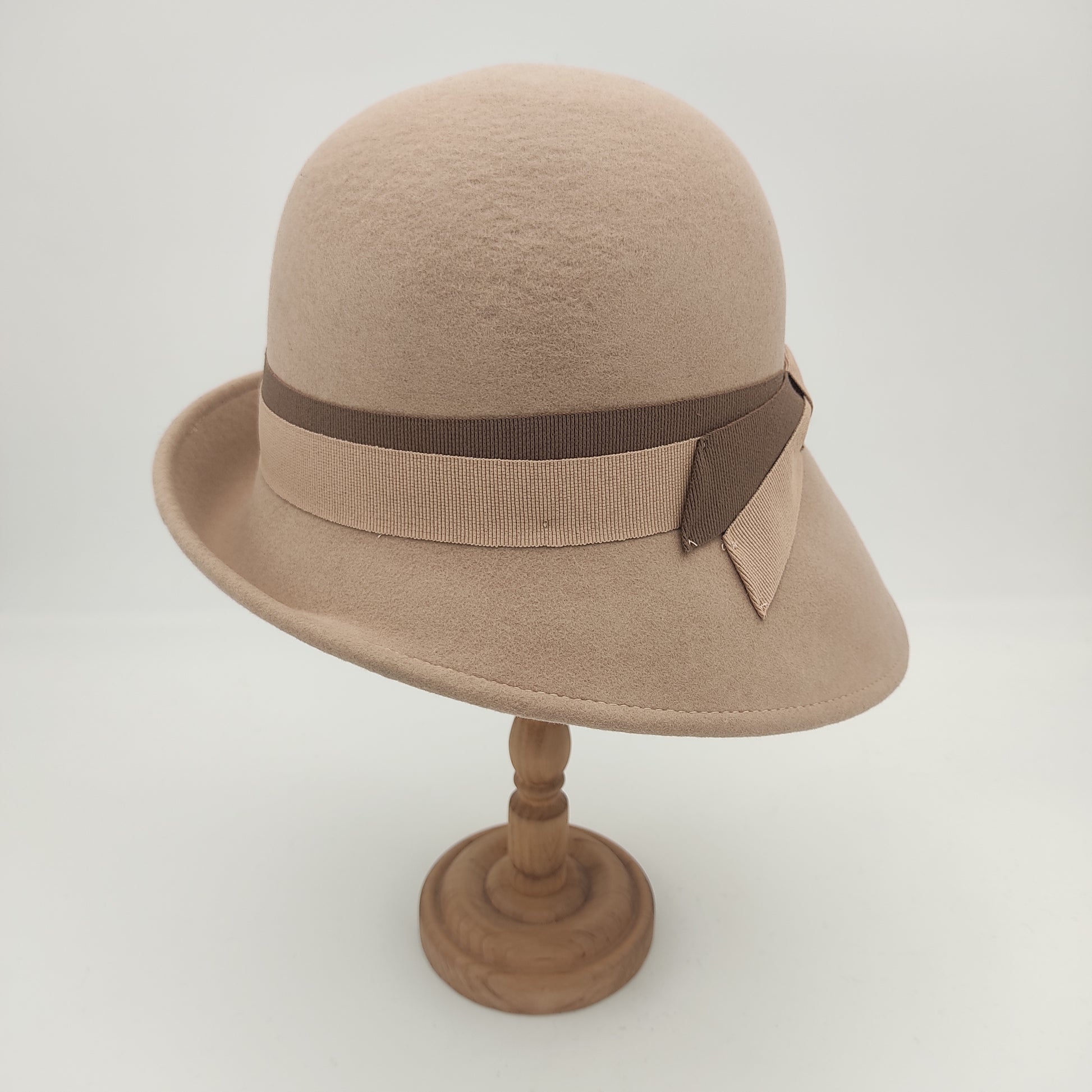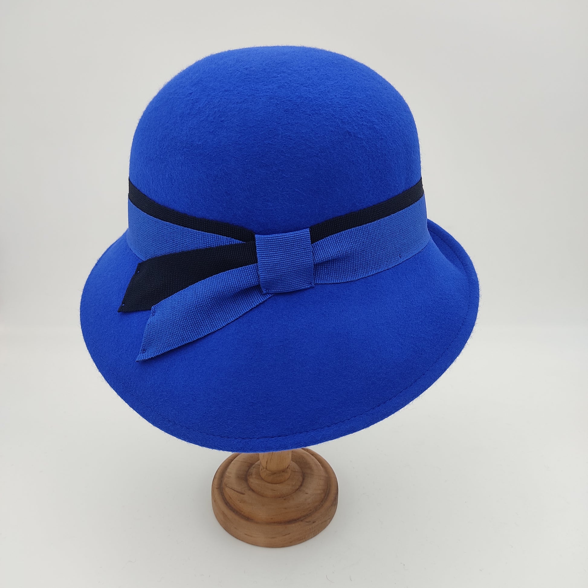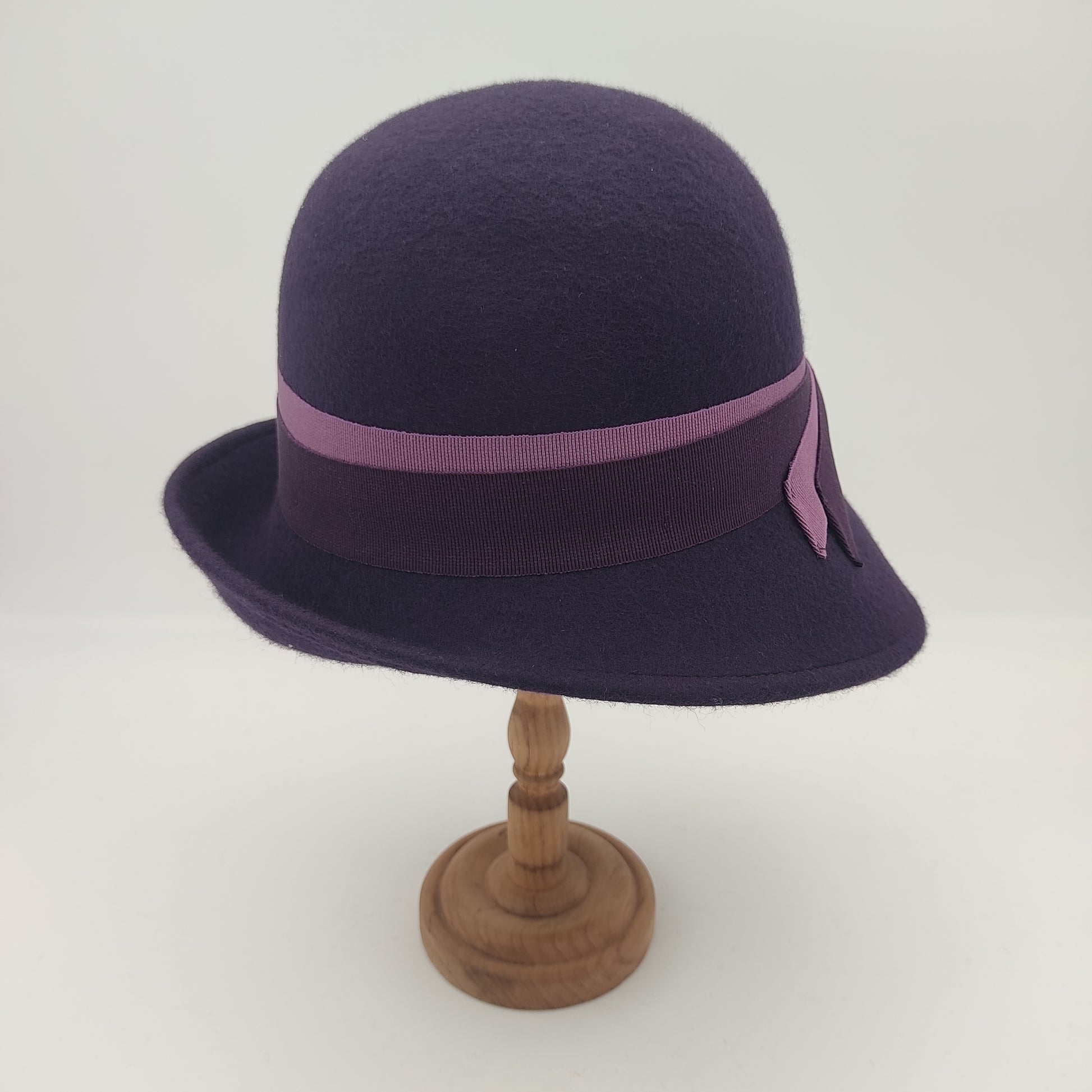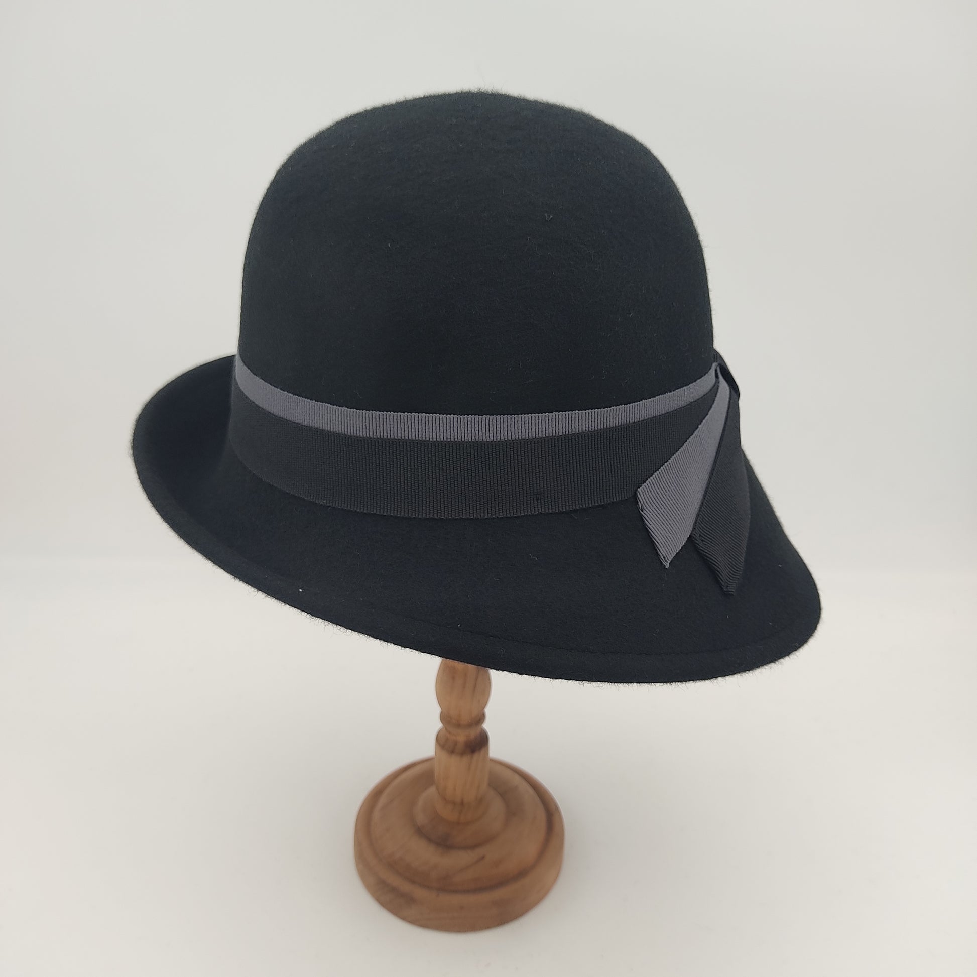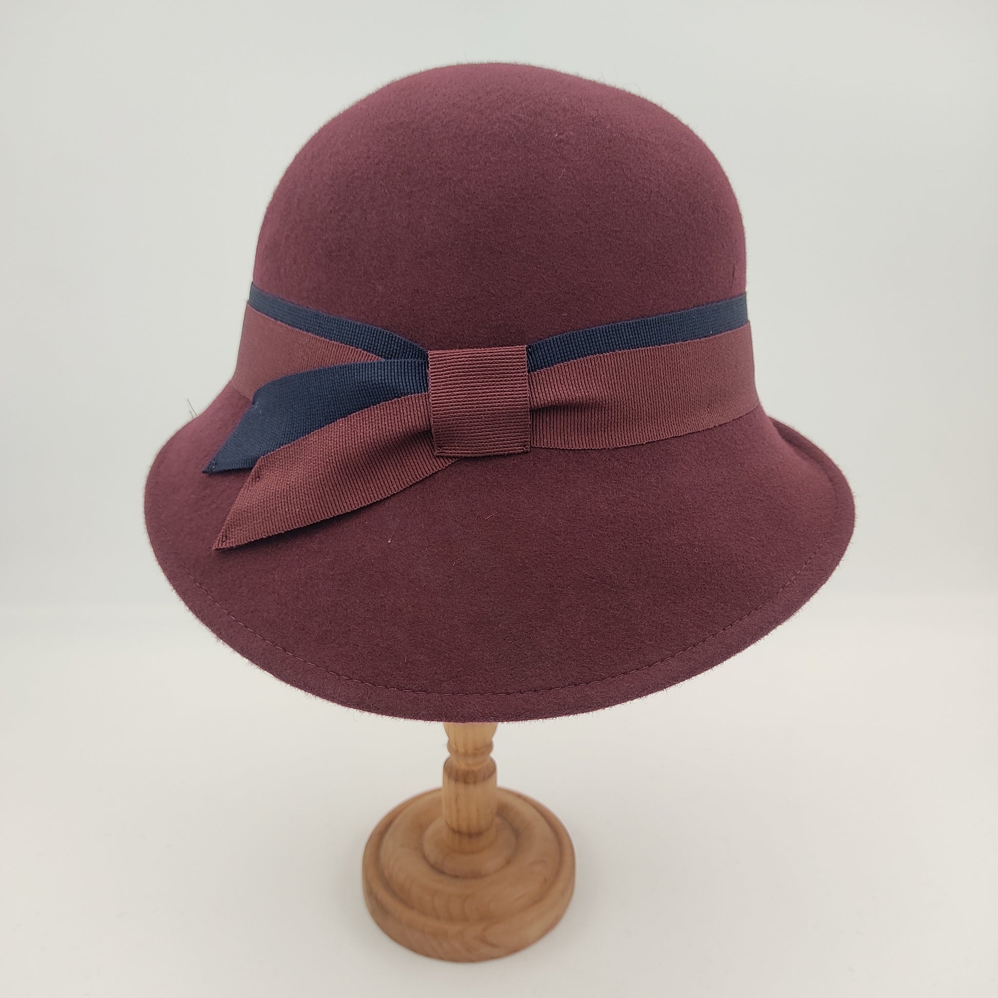 Il cappello Cora è una raffinata cloche asimmetrica per donna dallo stile elegante. Realizzato in Italia con feltro di lana al 100%, questo copricapo si distingue per la sua falda asimmetrica che raggiunge un'ampiezza di 9 cm.