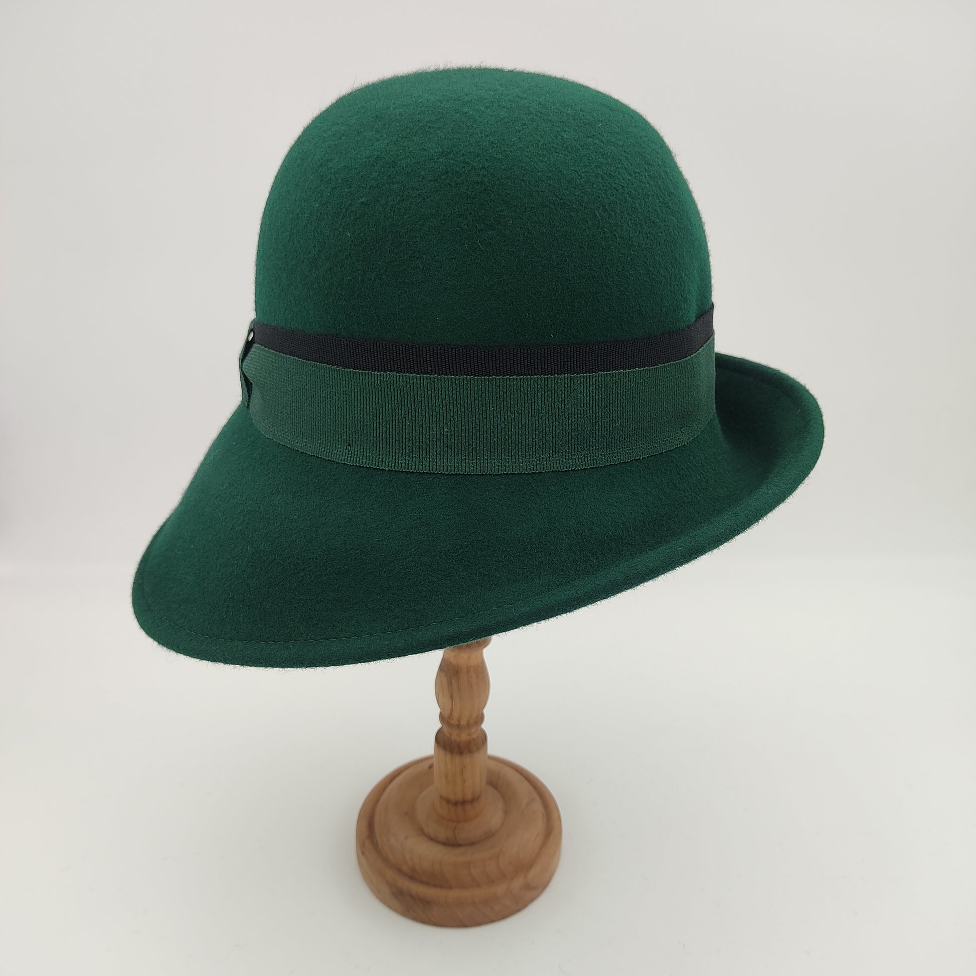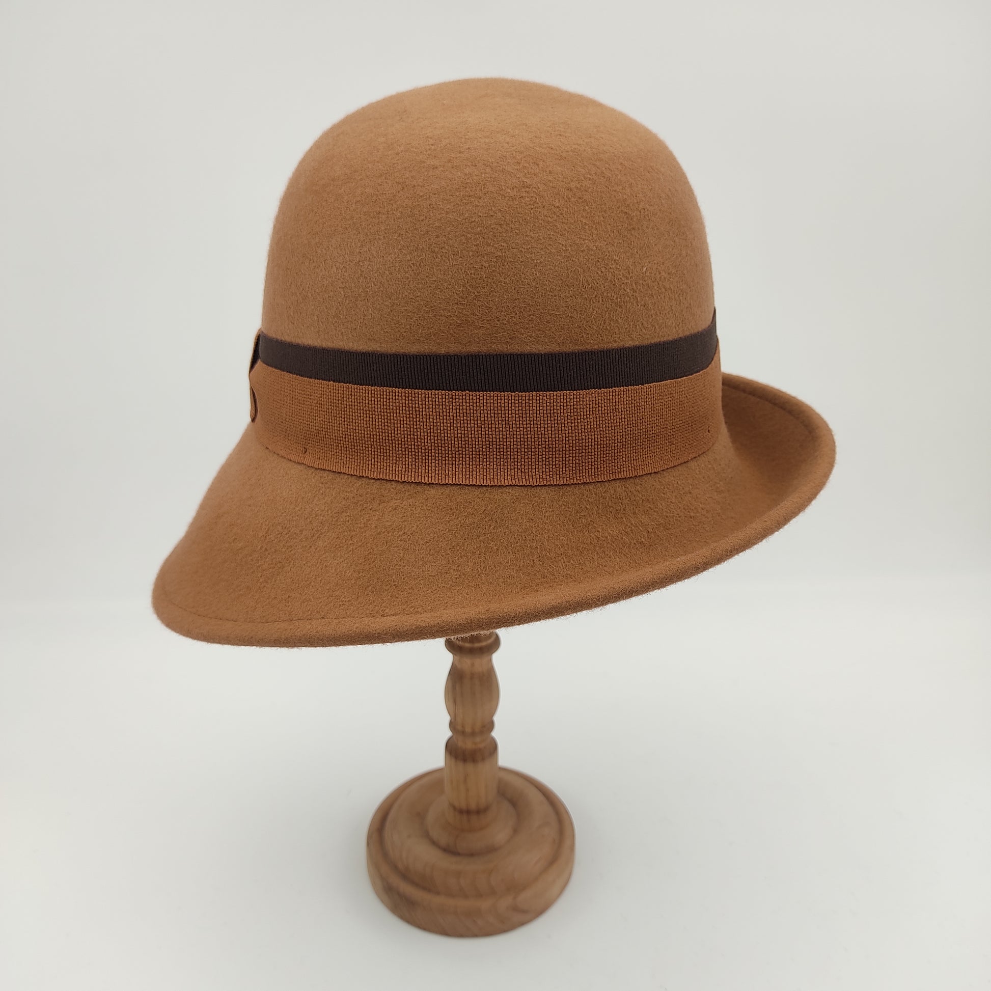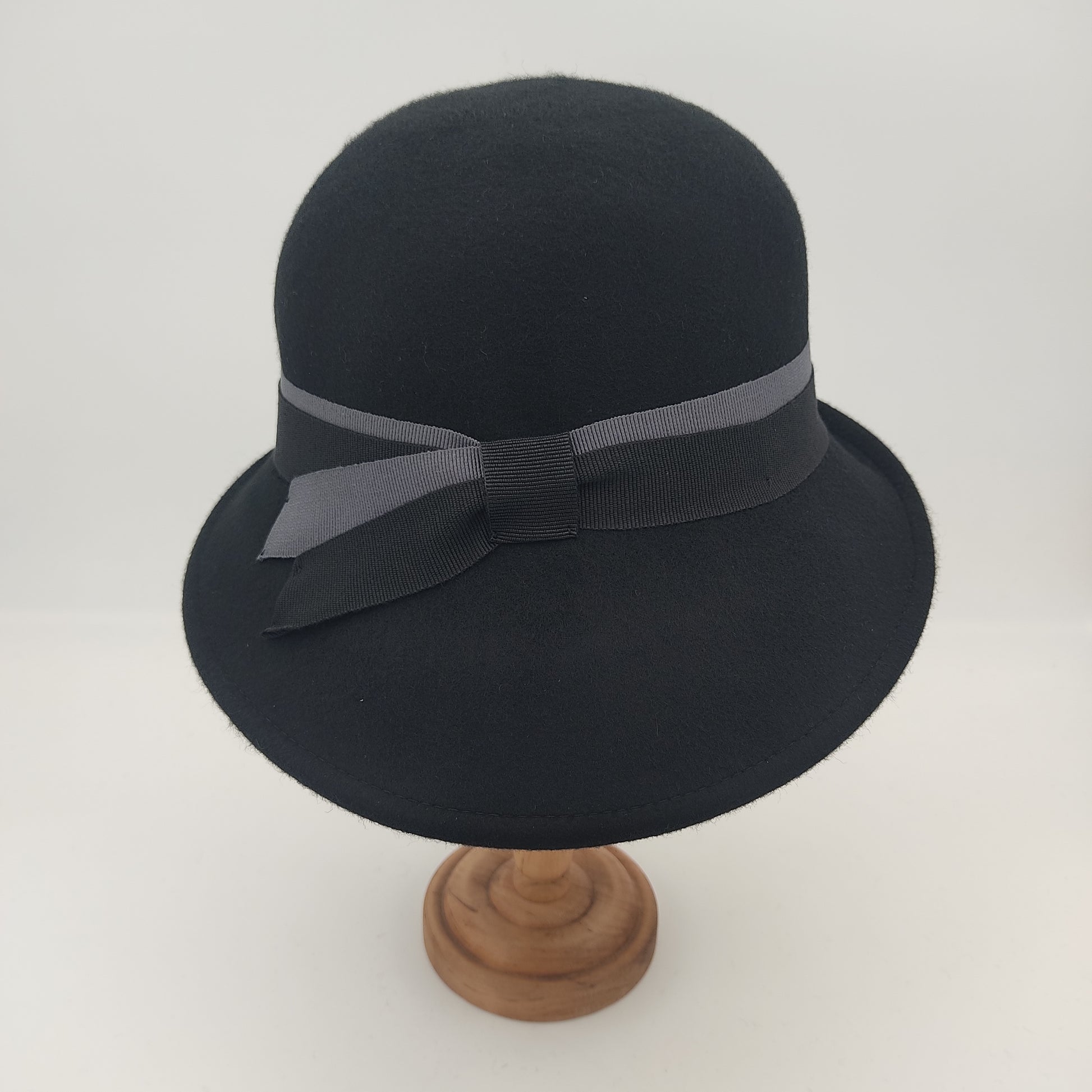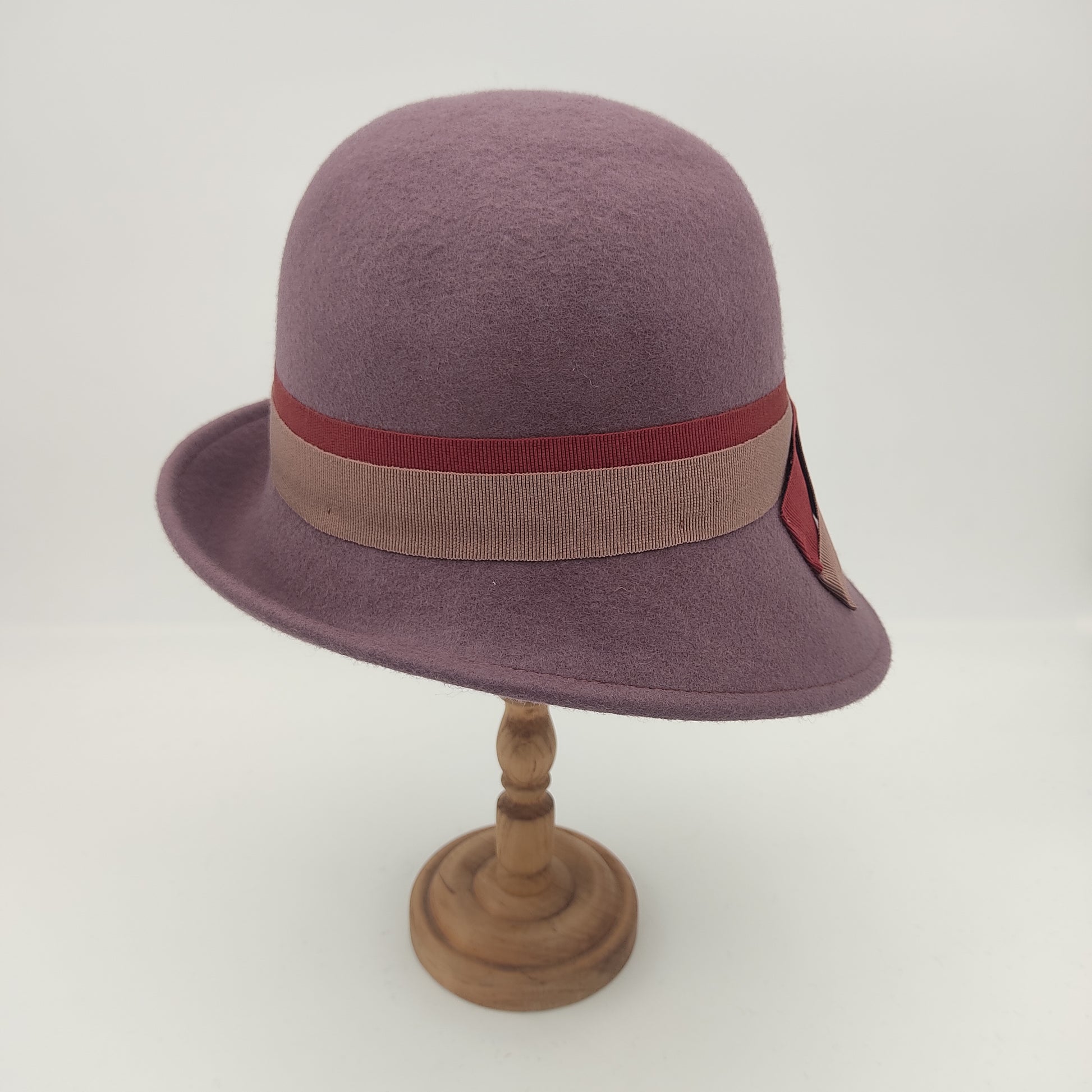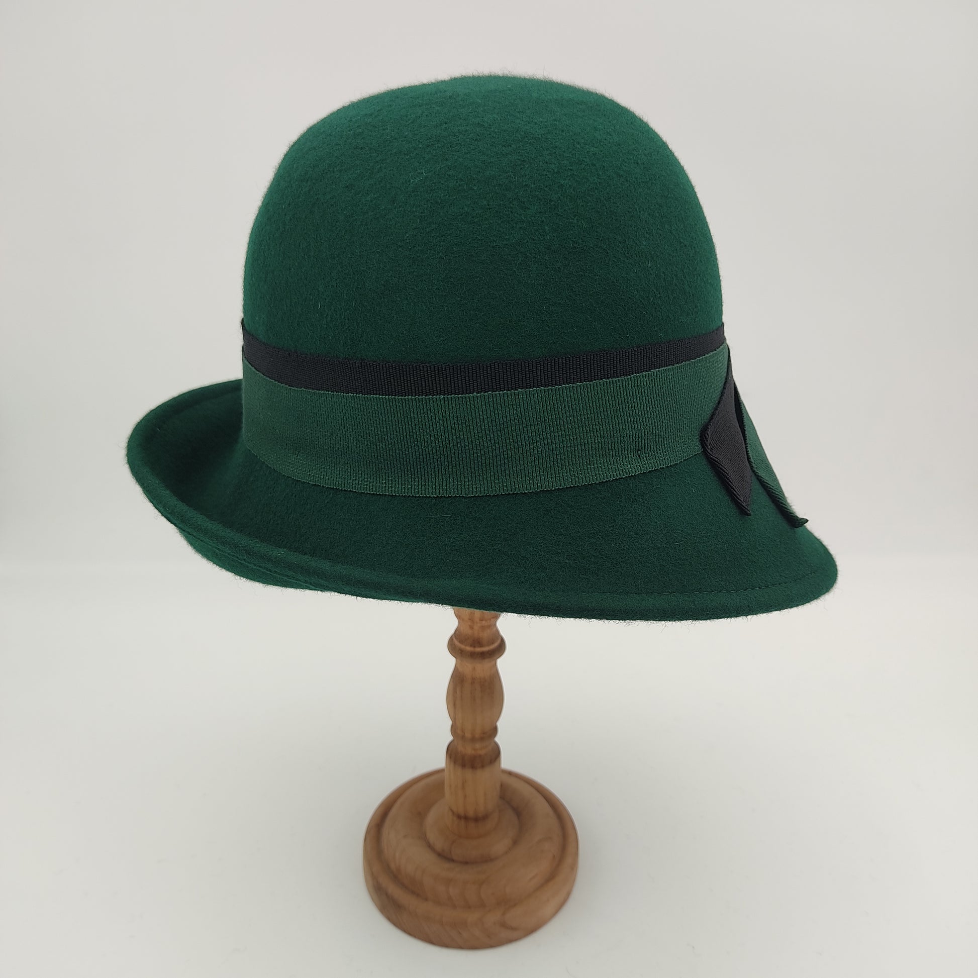 Il cappello Cora è una raffinata cloche asimmetrica per donna dallo stile elegante. Realizzato in Italia con feltro di lana al 100%, questo copricapo si distingue per la sua falda asimmetrica che raggiunge un'ampiezza di 9 cm.