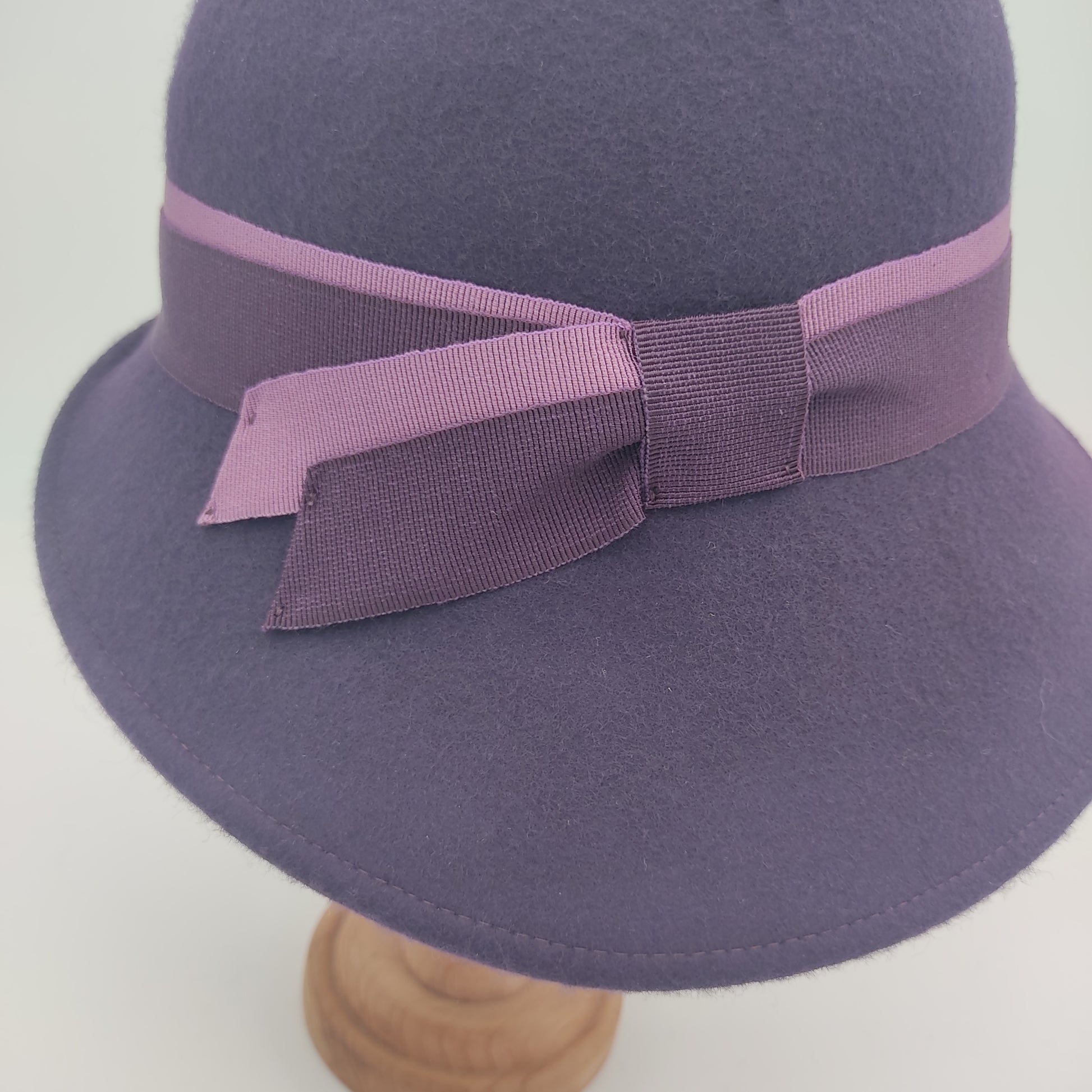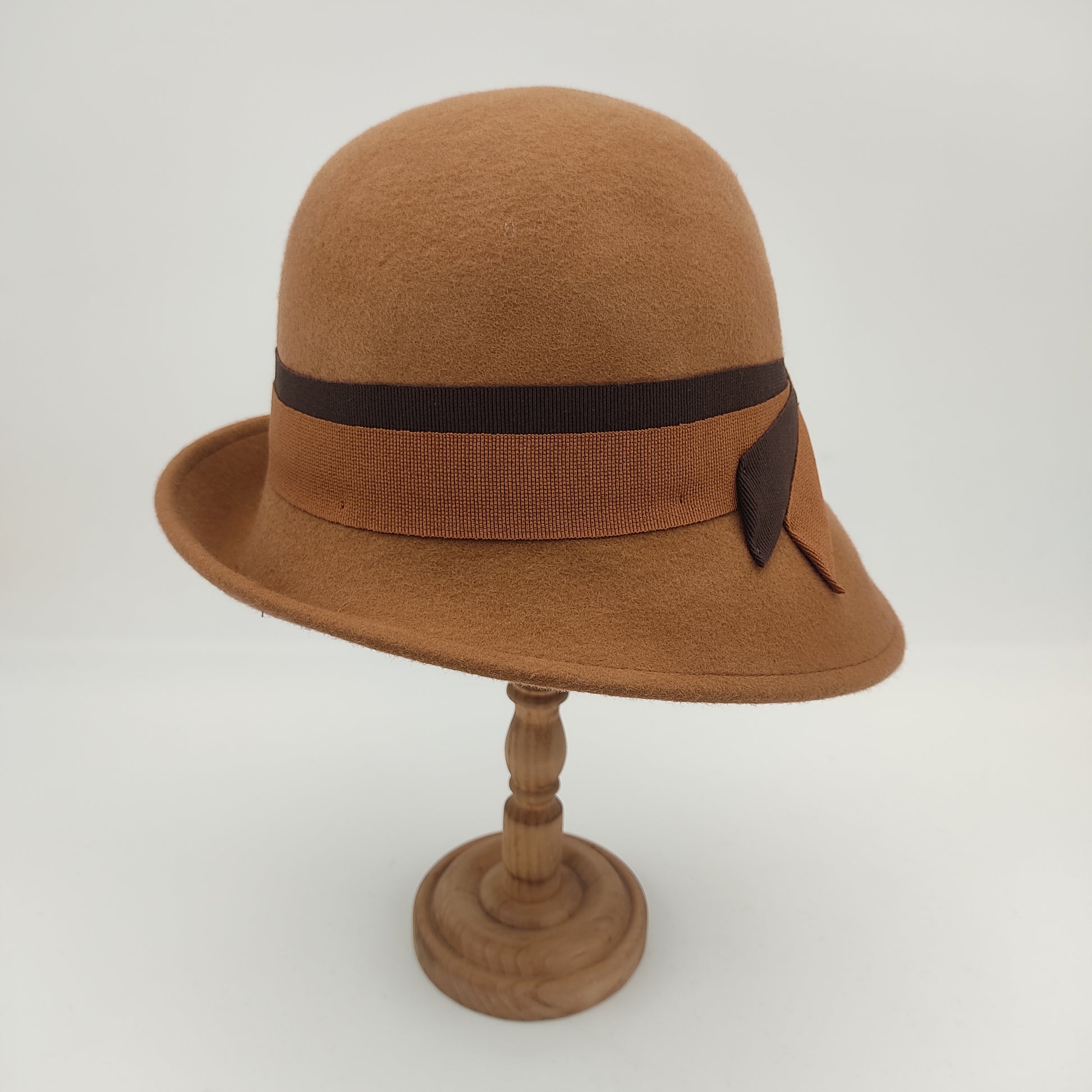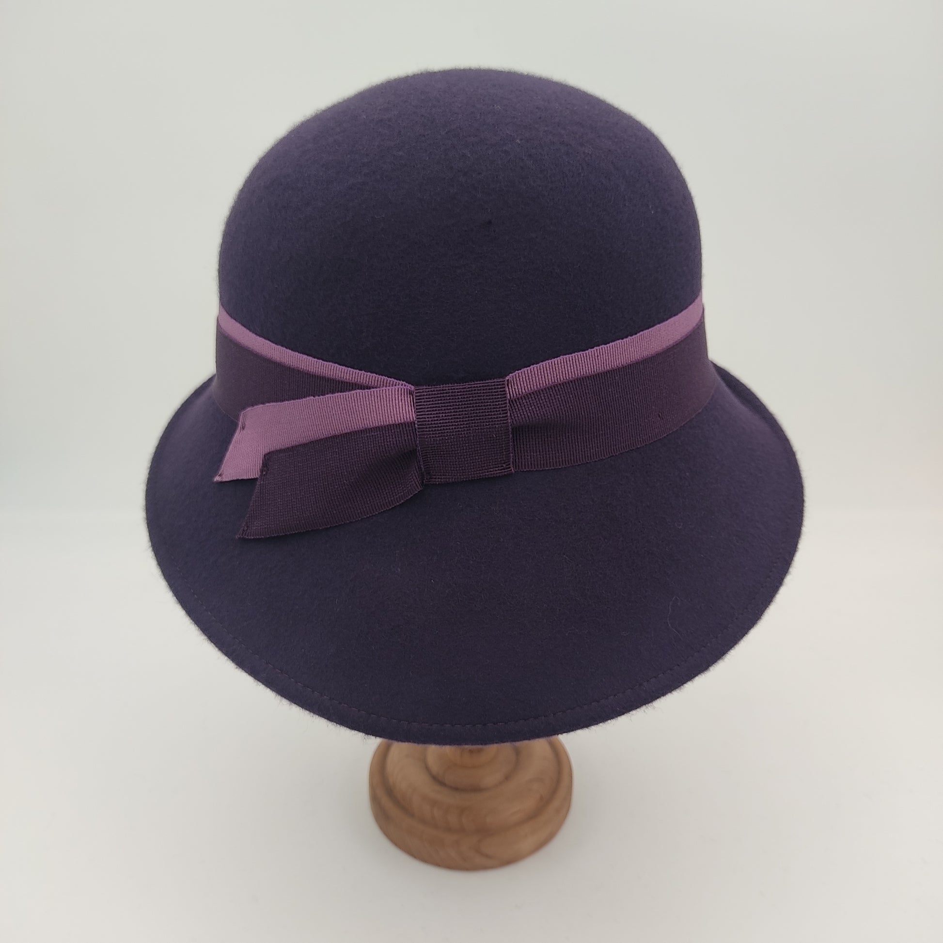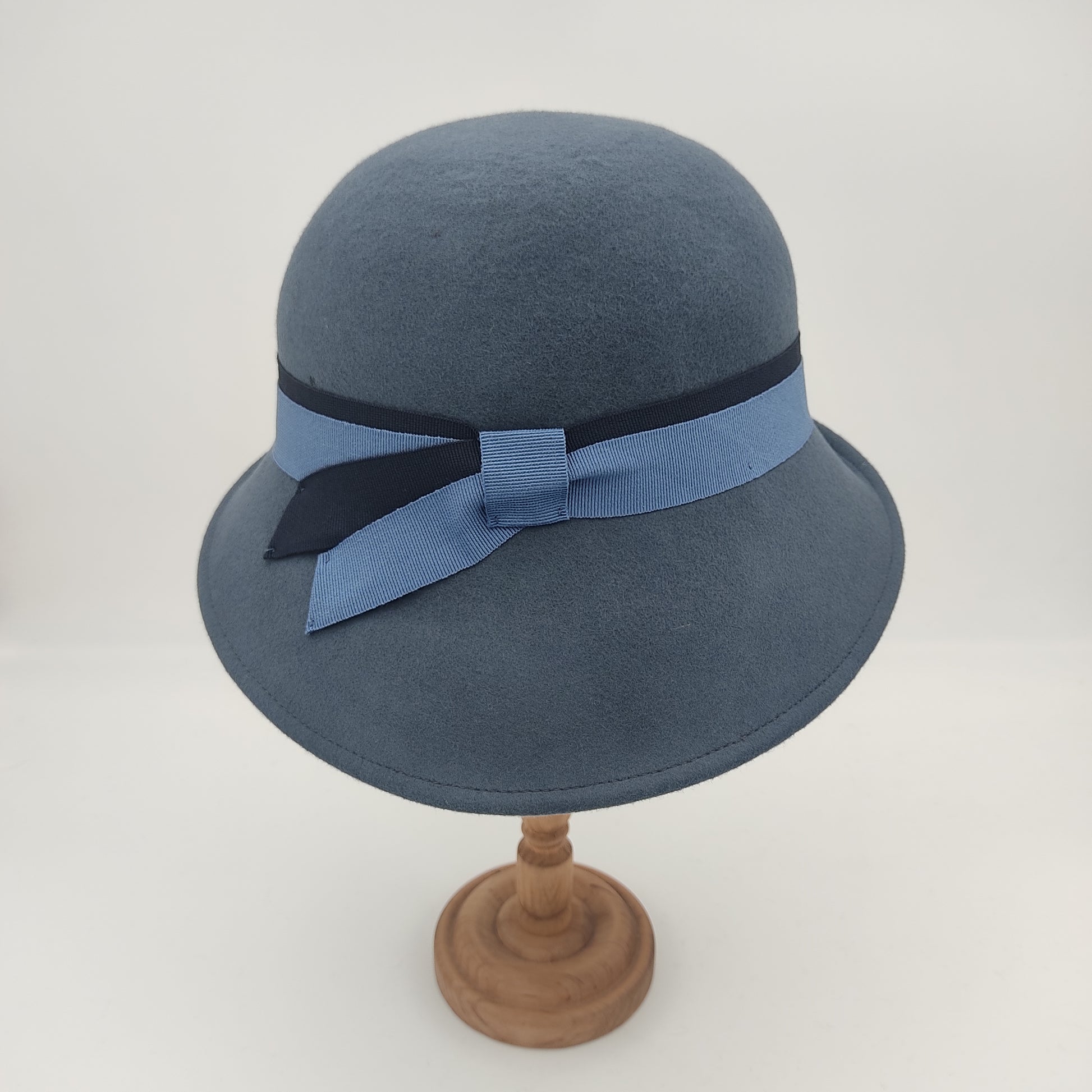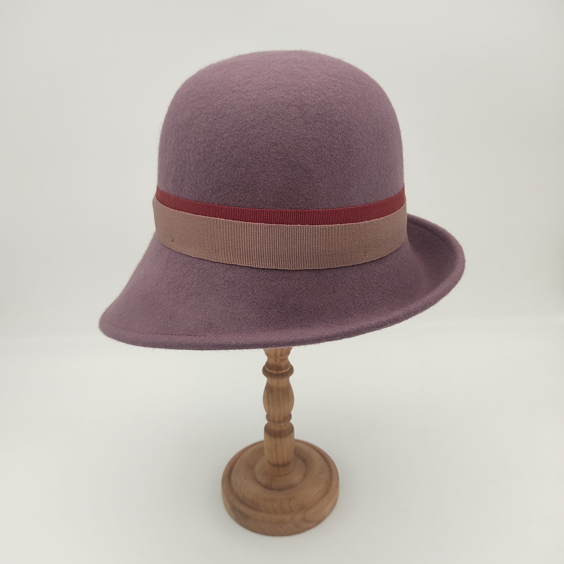 Il cappello Cora è una raffinata cloche asimmetrica per donna dallo stile elegante. Realizzato in Italia con feltro di lana al 100%, questo copricapo si distingue per la sua falda asimmetrica che raggiunge un'ampiezza di 9 cm.