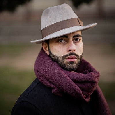 Il Fedora feltro è un elegante cappello da uomo realizzato in 100% feltro di lana. Questo classico modello fedora si distingue per la sua versatilità e raffinatezza. La falda di 6 cm può essere portata abbassata nella parte anteriore, nel tipico stile fedora, o alzata, richiamando la lobbia. La corona invece ha un'altezza di 10 cm e una forma a taglio.