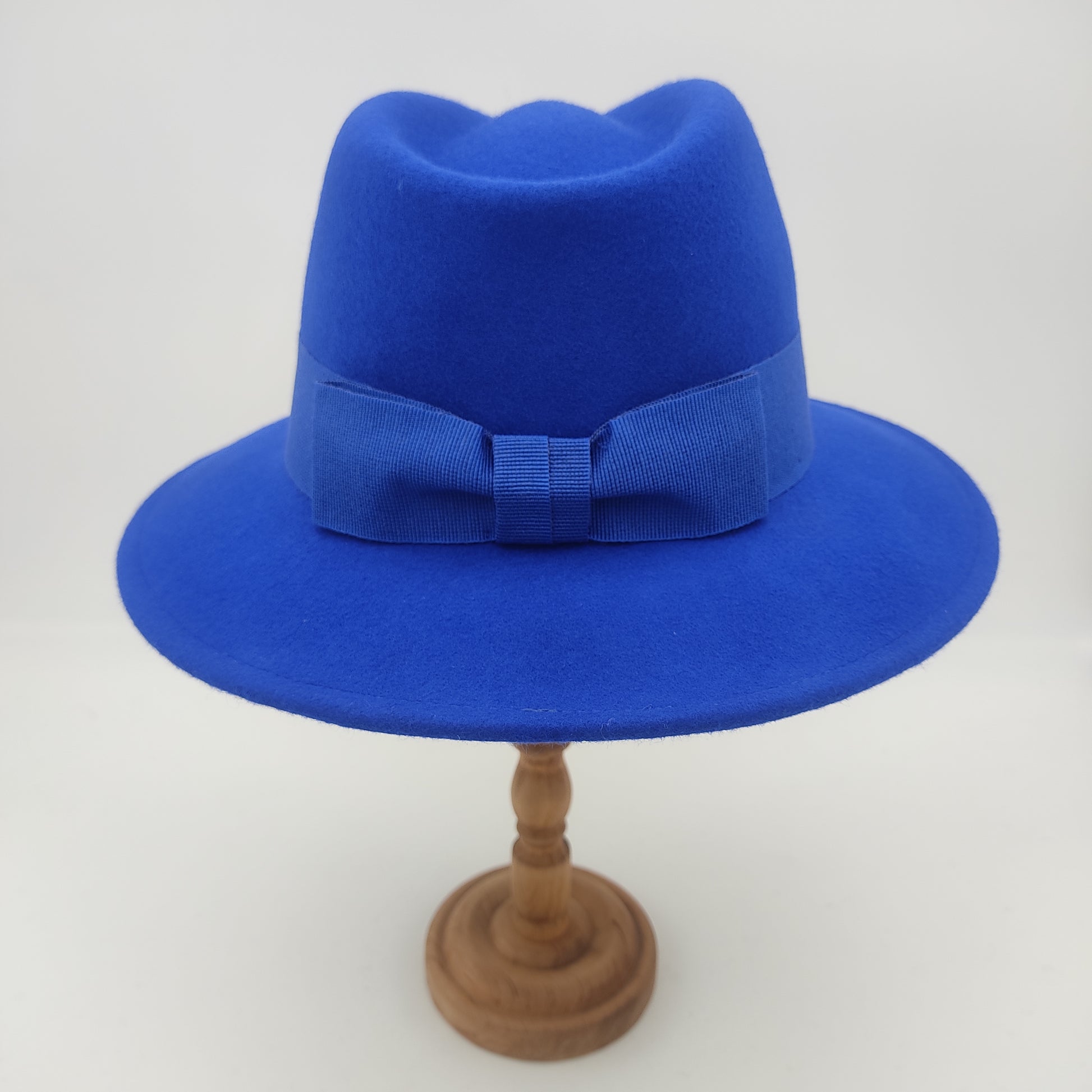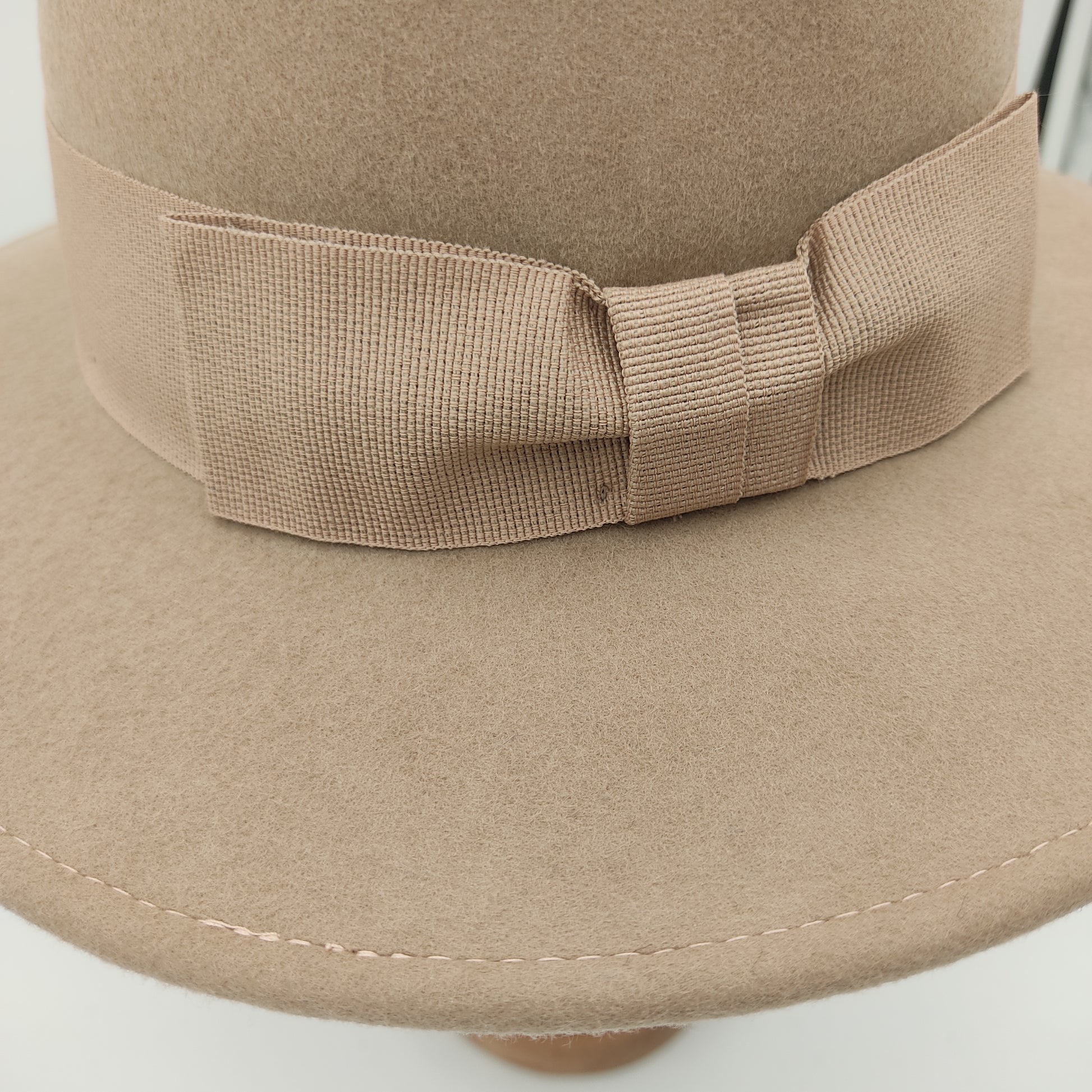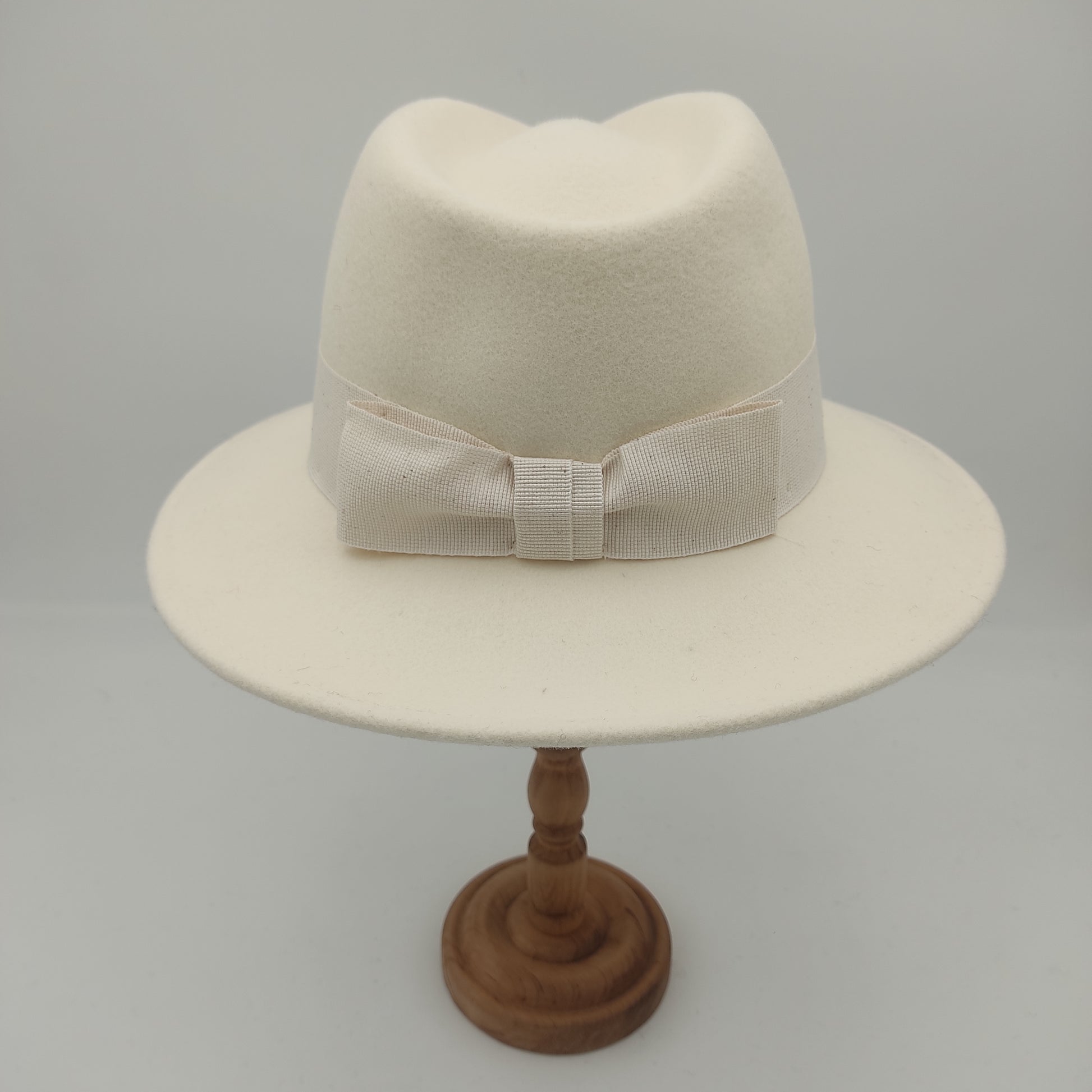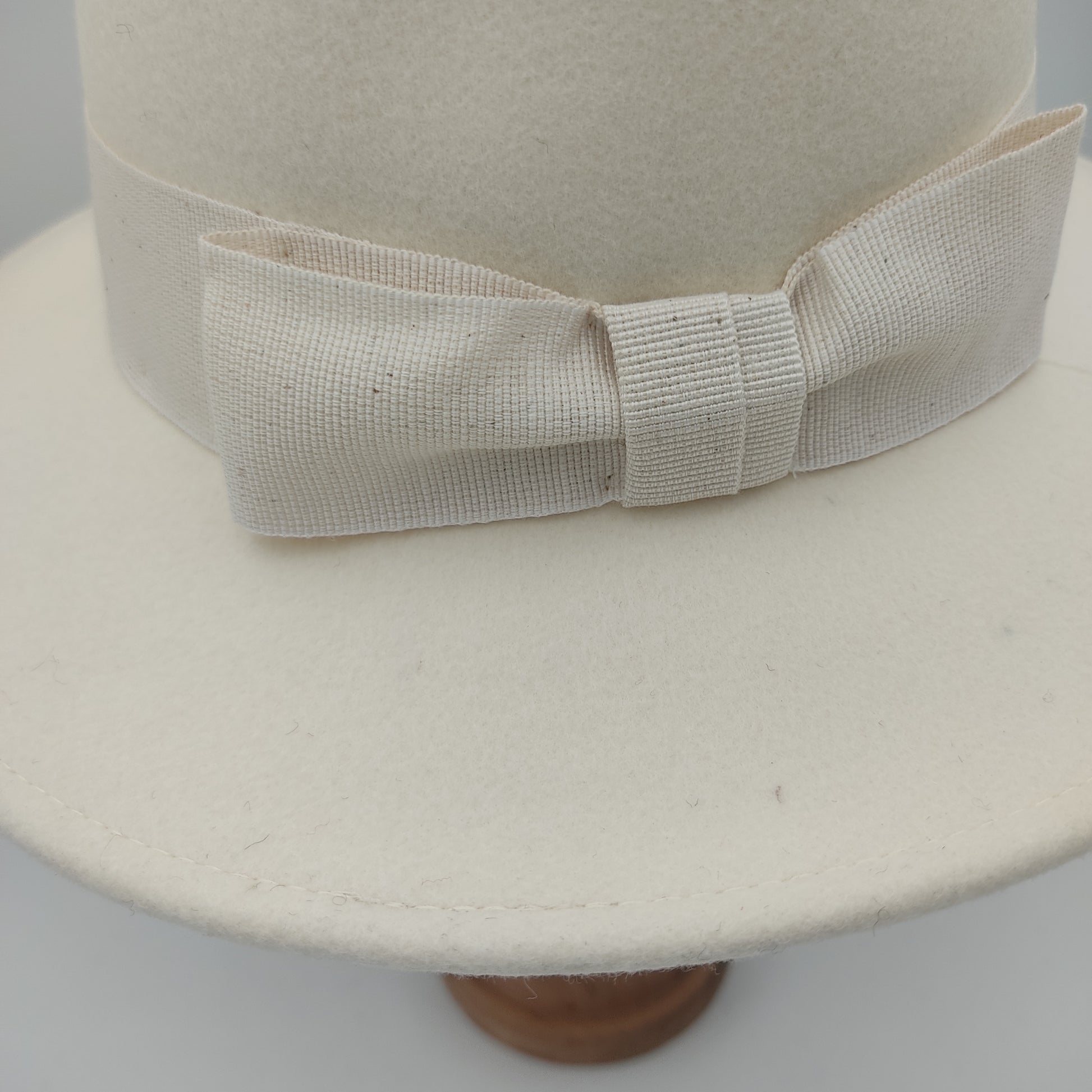 Realizzato in Italia con feltro di lana al 100%, Norma vanta una falda larga 7 cm leggermente spiovente che conferisce un'elegante silhouette al cappello. La testa a goccia si adatta perfettamente alla forma del capo, mentre la decorazione con gros grain tono su tono di 4 cm e il fiocco posteriore aggiungono un dettaglio raffinato.
