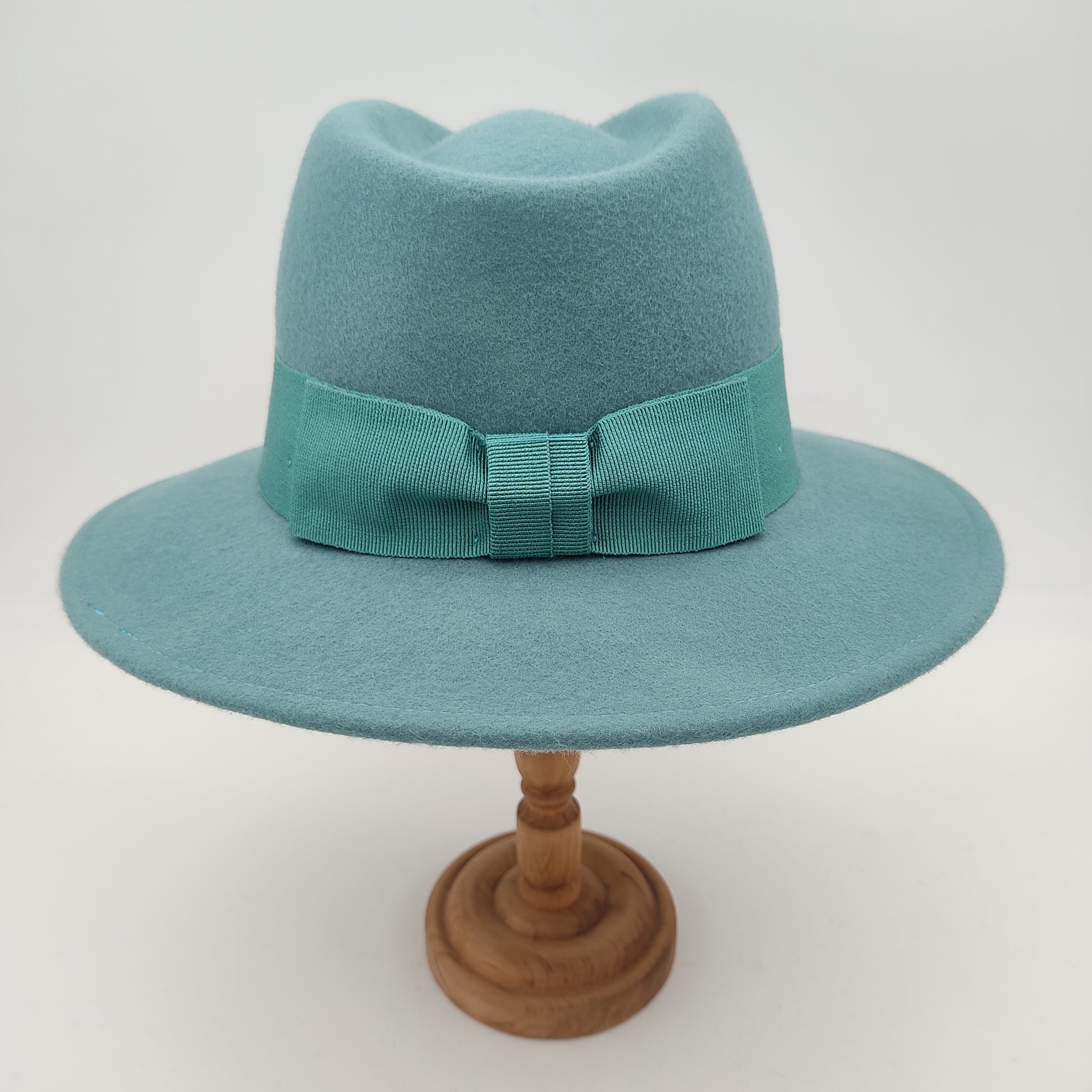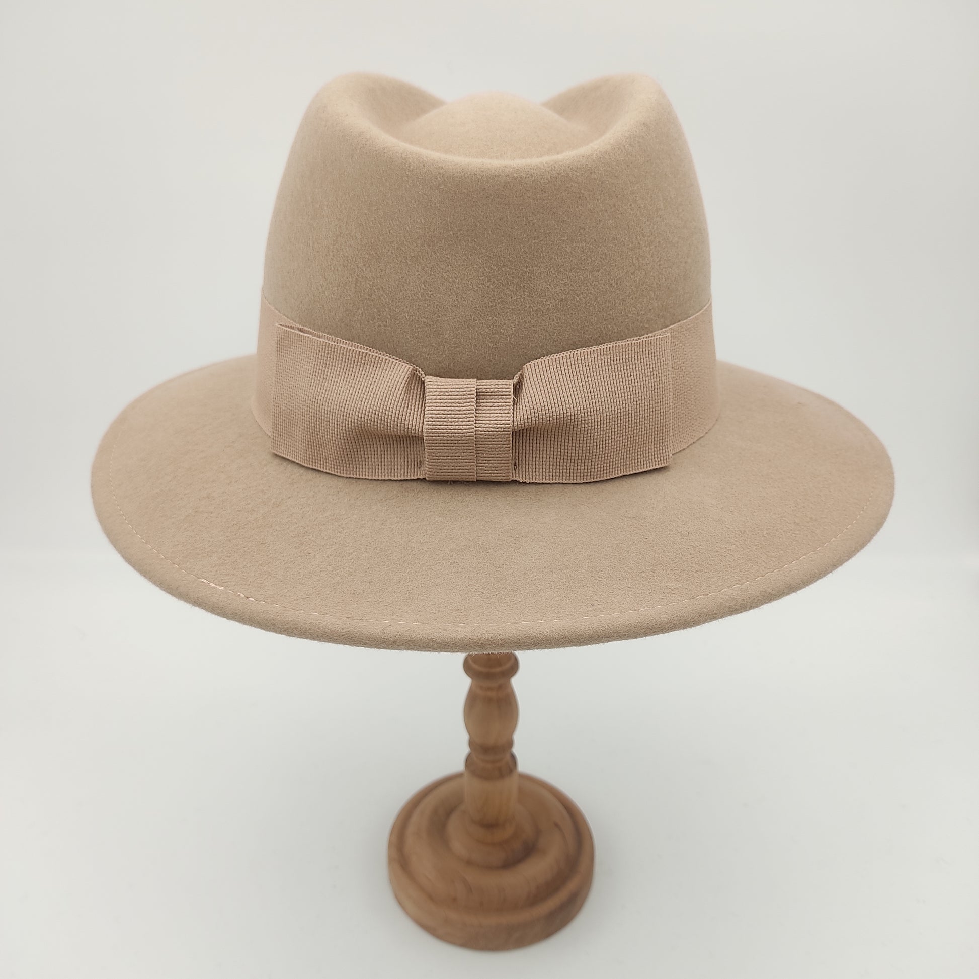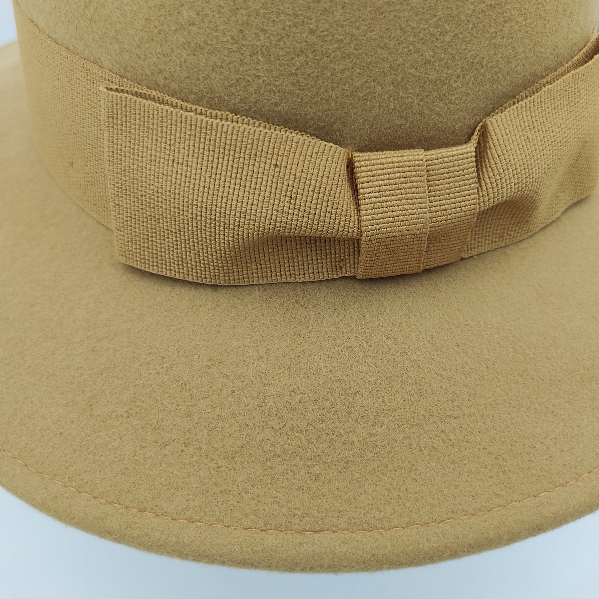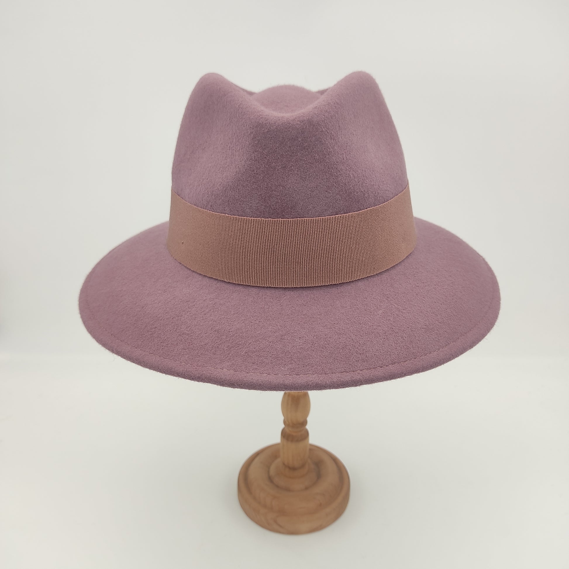 Realizzato in Italia con feltro di lana al 100%, Norma vanta una falda larga 7 cm leggermente spiovente che conferisce un'elegante silhouette al cappello. La testa a goccia si adatta perfettamente alla forma del capo, mentre la decorazione con gros grain tono su tono di 4 cm e il fiocco posteriore aggiungono un dettaglio raffinato.