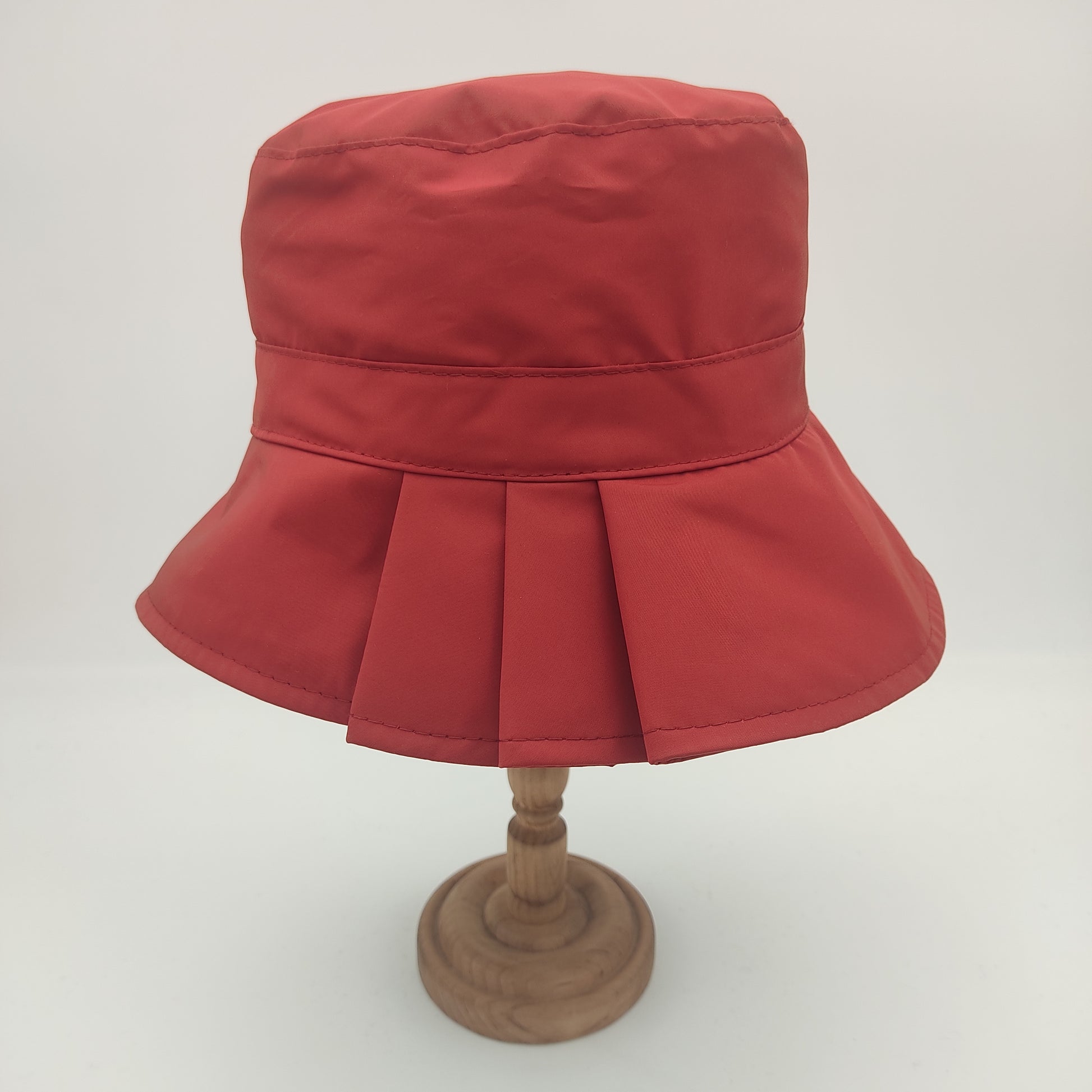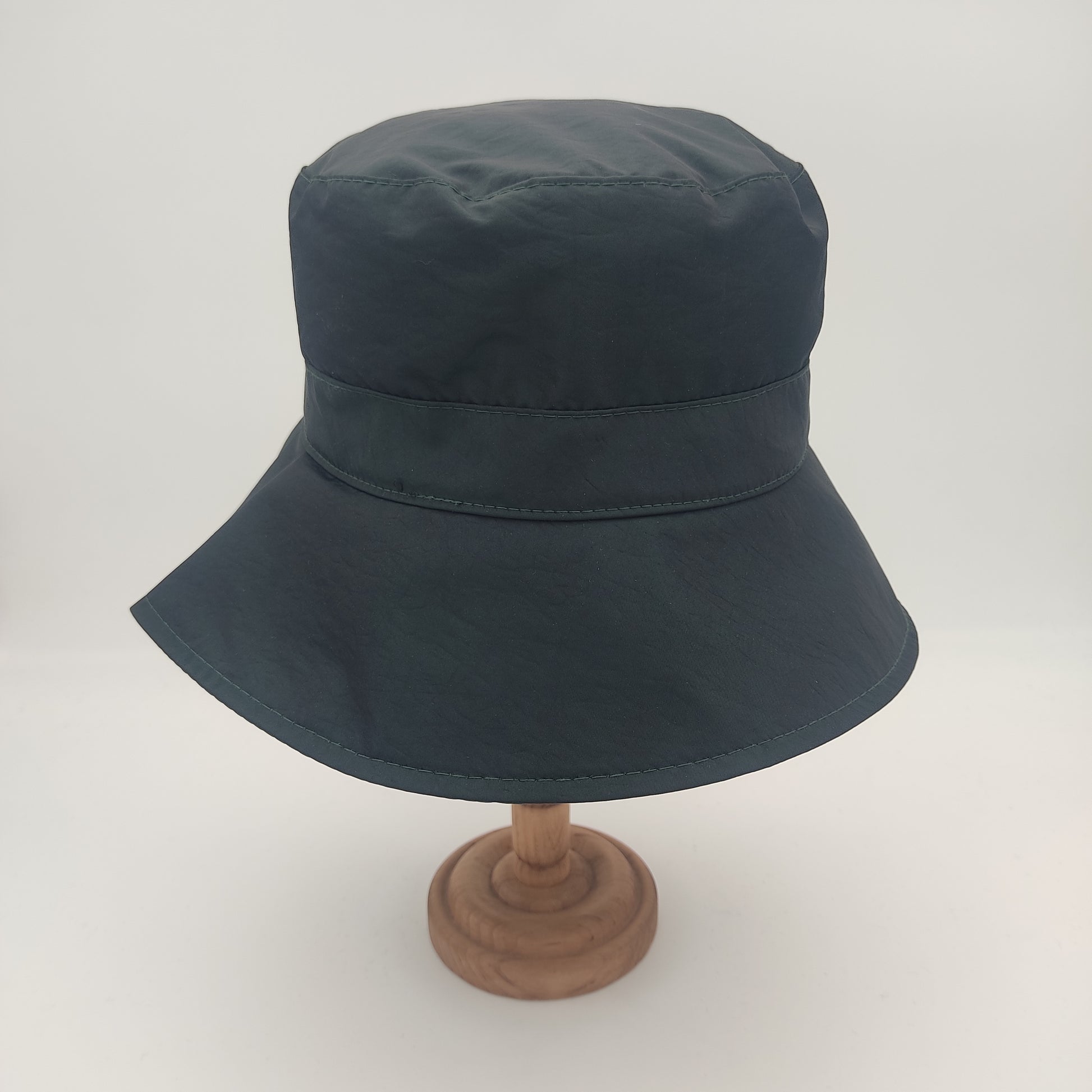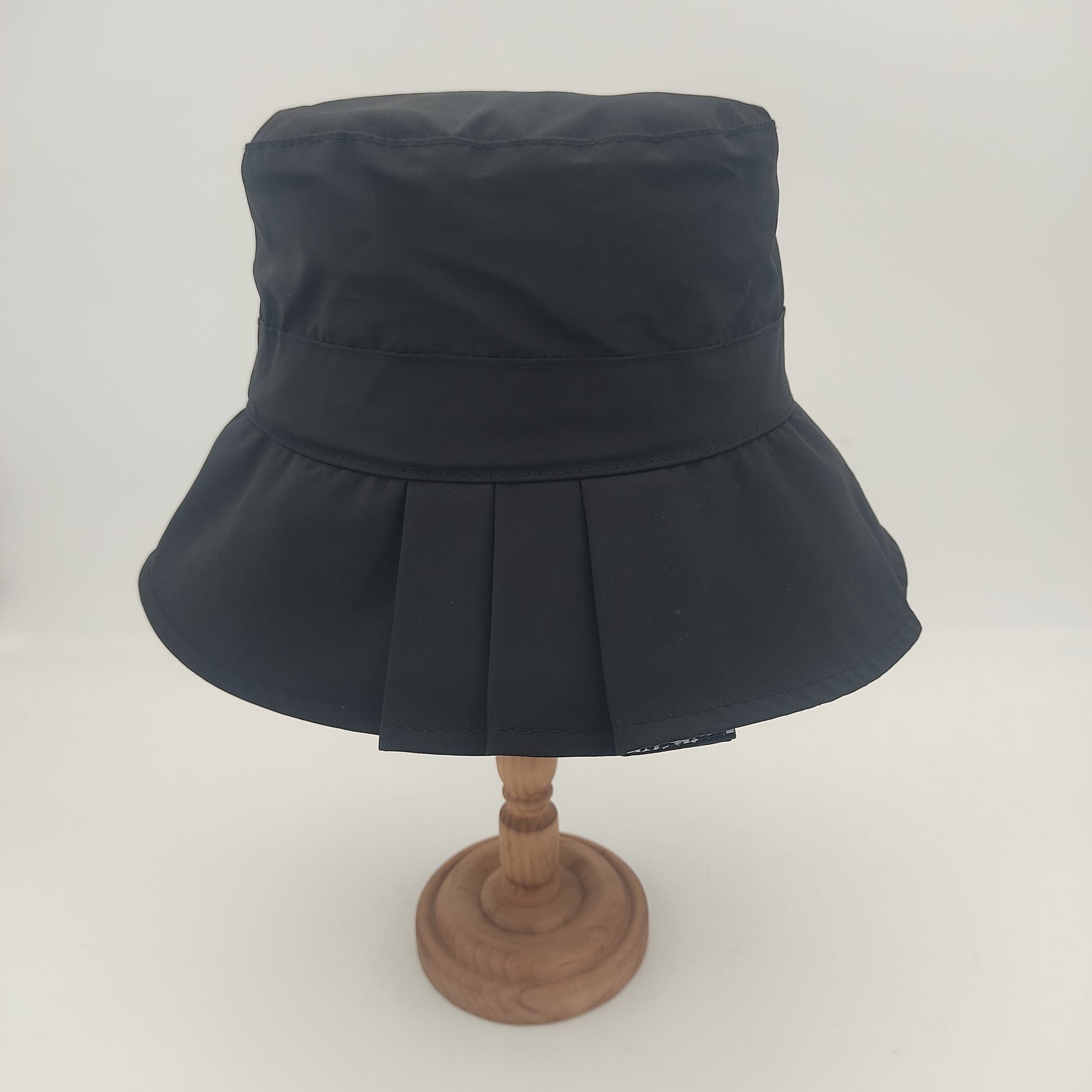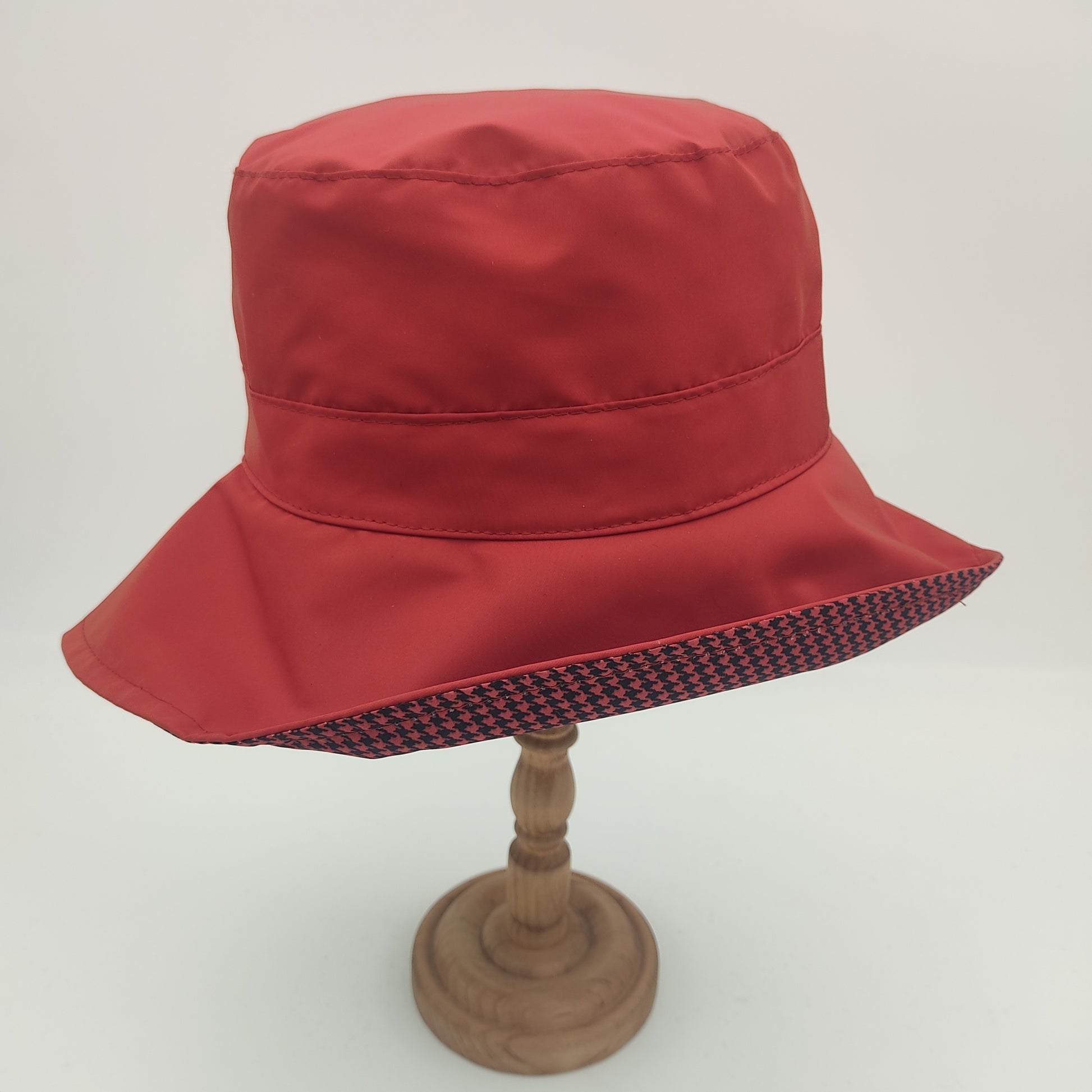 Il cappello Pioggia plisset è un modello da donna in stile pescatore con eleganti plisset laterali. Realizzato in un tessuto impermeabile composto da 58% poliammide e 42% poliestere, questo cappello Made in Italy si distingue per la sua corona squadrata alta 10 cm che garantisce un'ottima vestibilità, e una falda di 7.5 cm. La versione verde e quella blu presentano un sottotesa più chiaro, mentre nelle varianti nero e rosso il sottotesa è impreziosito da una raffinata fantasia pied de poule. Il materiale resistente e impermeabile, insieme alla pratica caratteristica di essere arrotolabile, lo rende perfetto per affrontare con stile le giornate di pioggia.