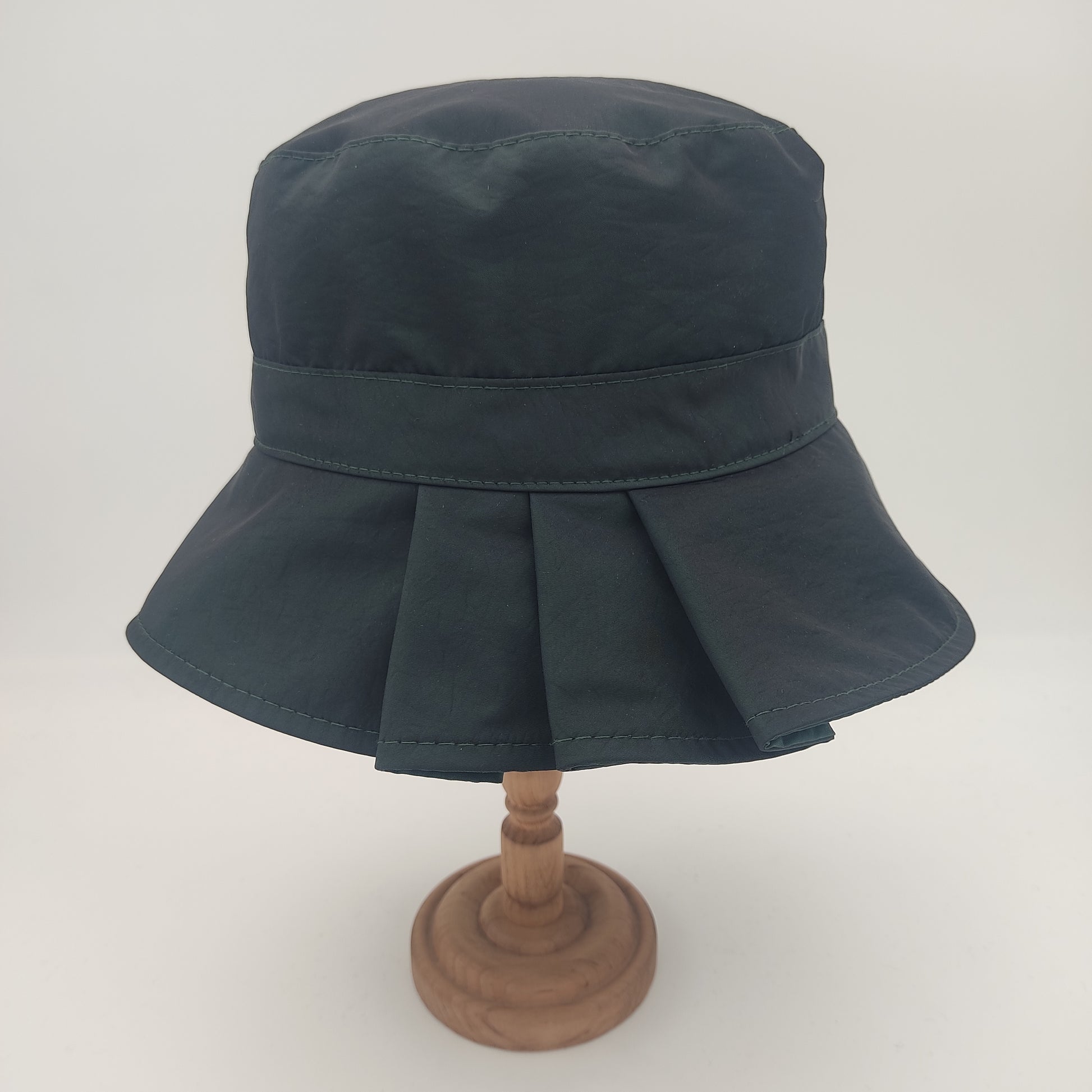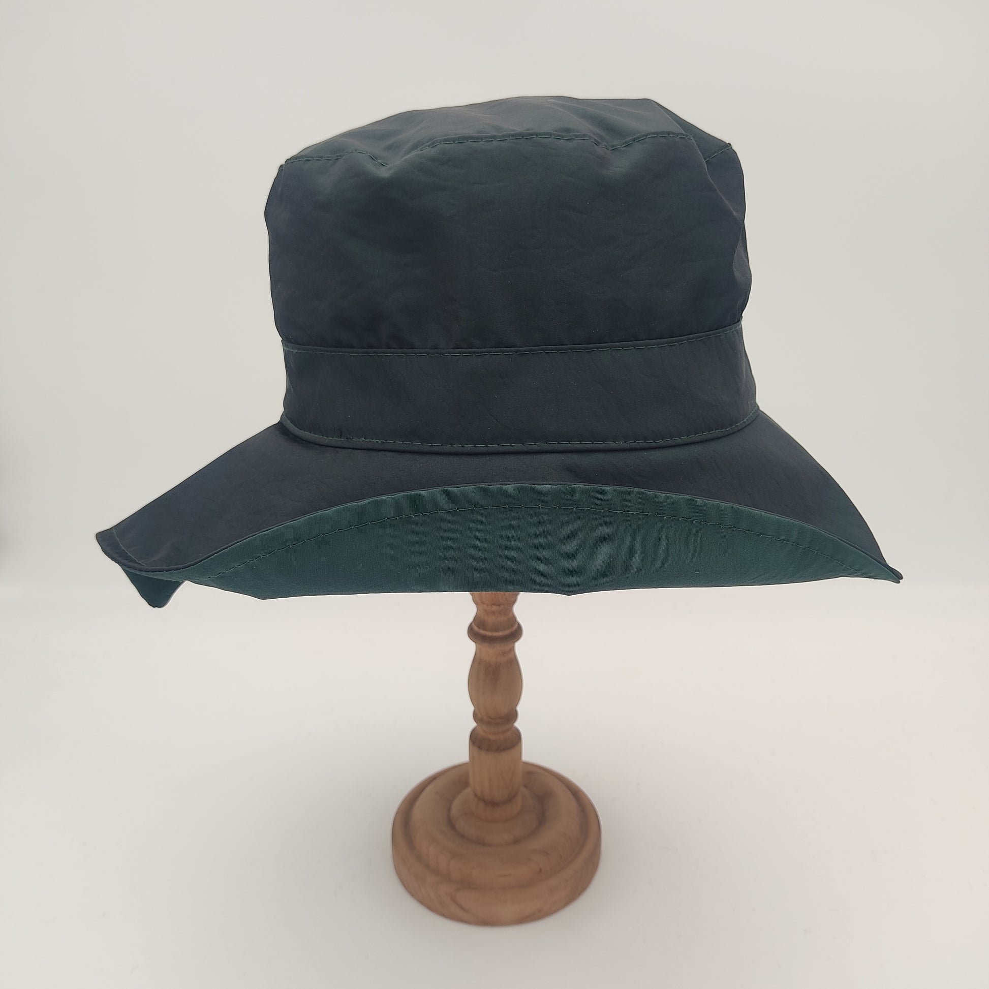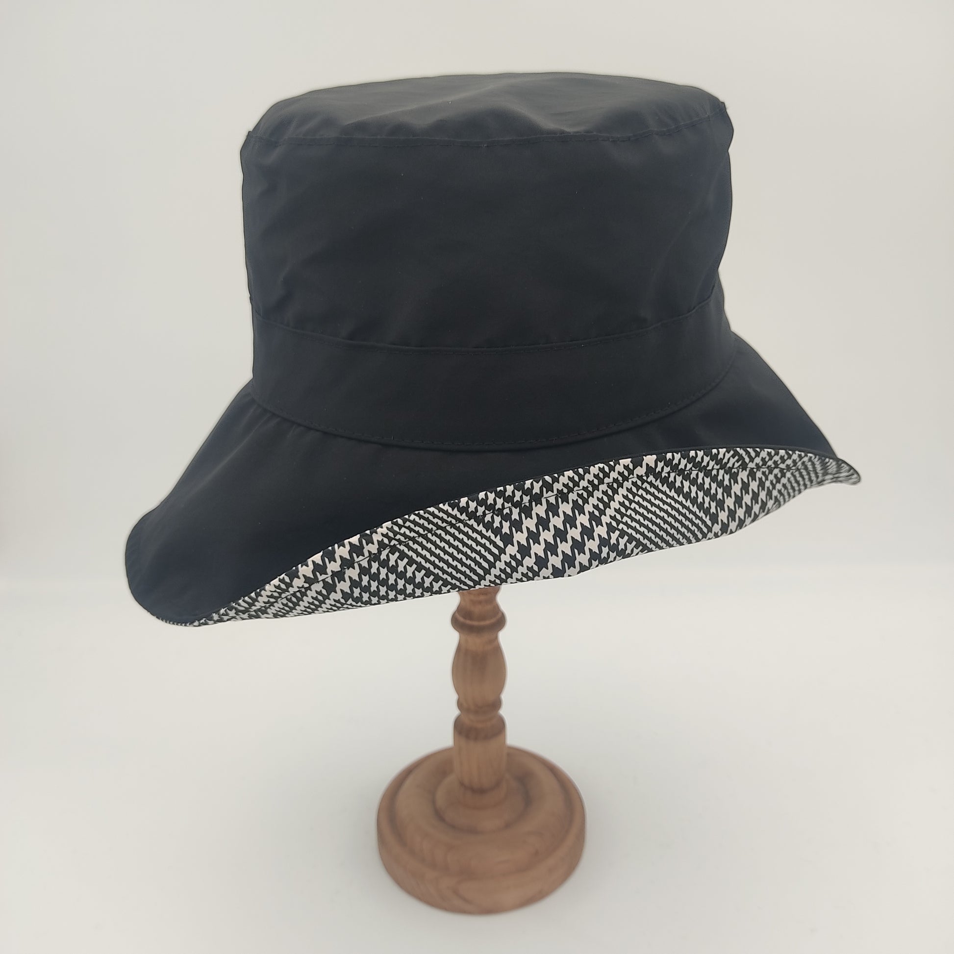 Il cappello Pioggia plisset è un modello da donna in stile pescatore con eleganti plisset laterali. Realizzato in un tessuto impermeabile composto da 58% poliammide e 42% poliestere, questo cappello Made in Italy si distingue per la sua corona squadrata alta 10 cm che garantisce un'ottima vestibilità, e una falda di 7.5 cm. La versione verde e quella blu presentano un sottotesa più chiaro, mentre nelle varianti nero e rosso il sottotesa è impreziosito da una raffinata fantasia pied de poule. Il materiale resistente e impermeabile, insieme alla pratica caratteristica di essere arrotolabile, lo rende perfetto per affrontare con stile le giornate di pioggia.