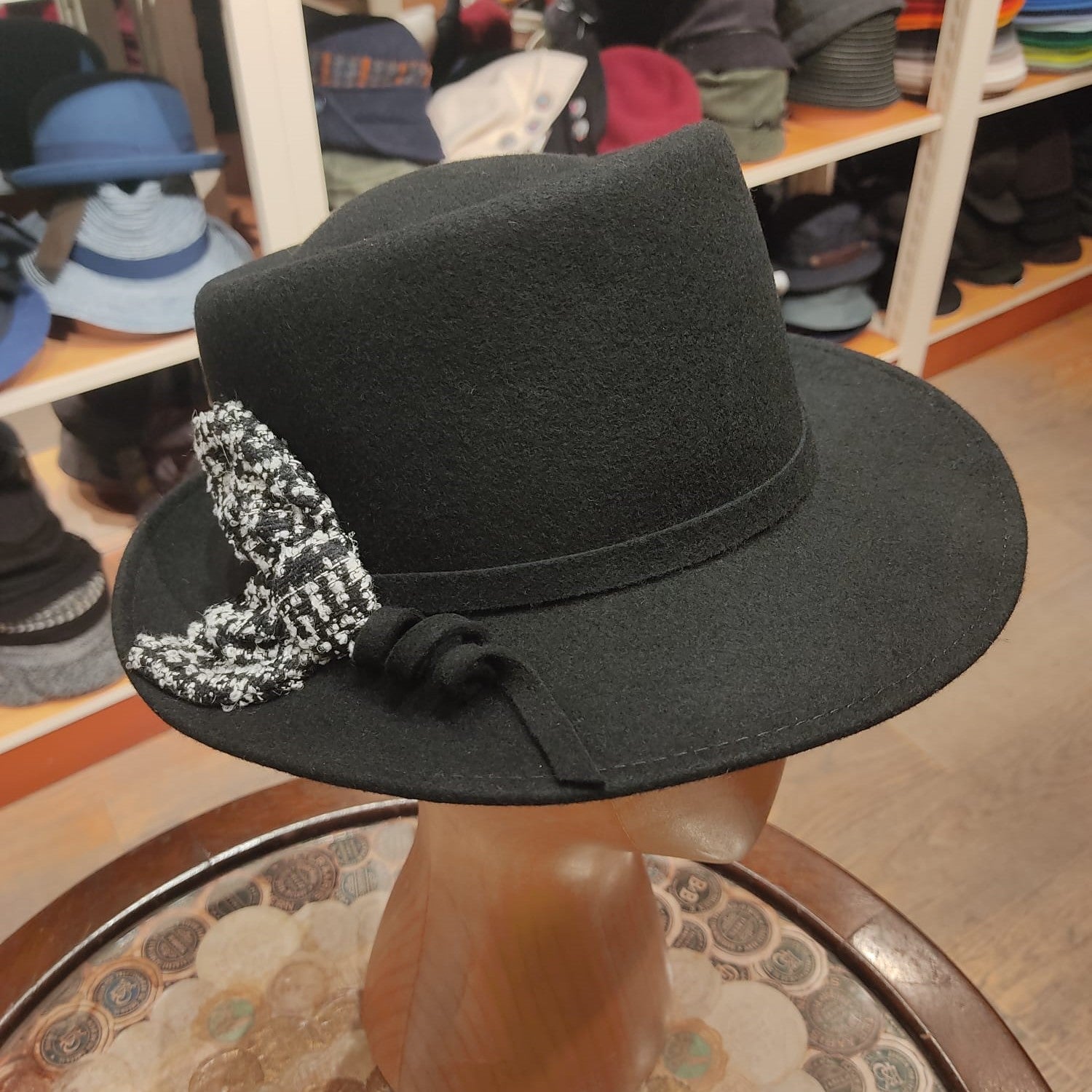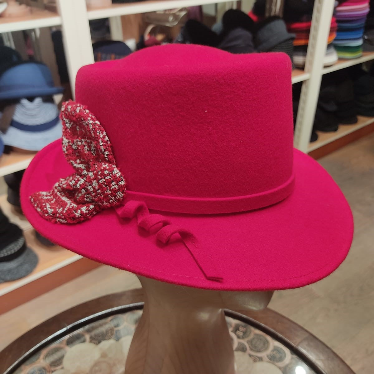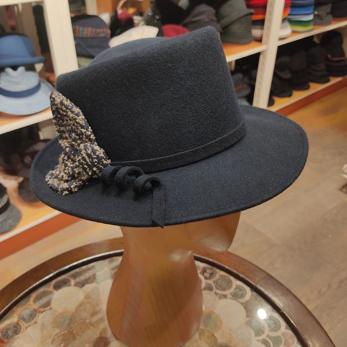 Desgin: Il nostro modello Roby è ispirato al fedora. Lo abbiamo realizzato con una falda media, un doppio laccio in simil pelle che finisce con due piccole borchie in metallo che formano un fiocco aperto a fiore.