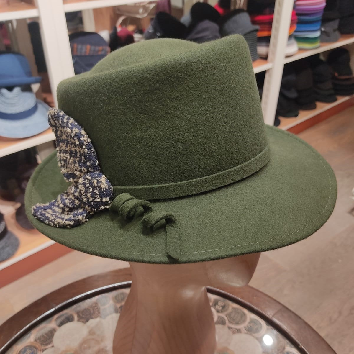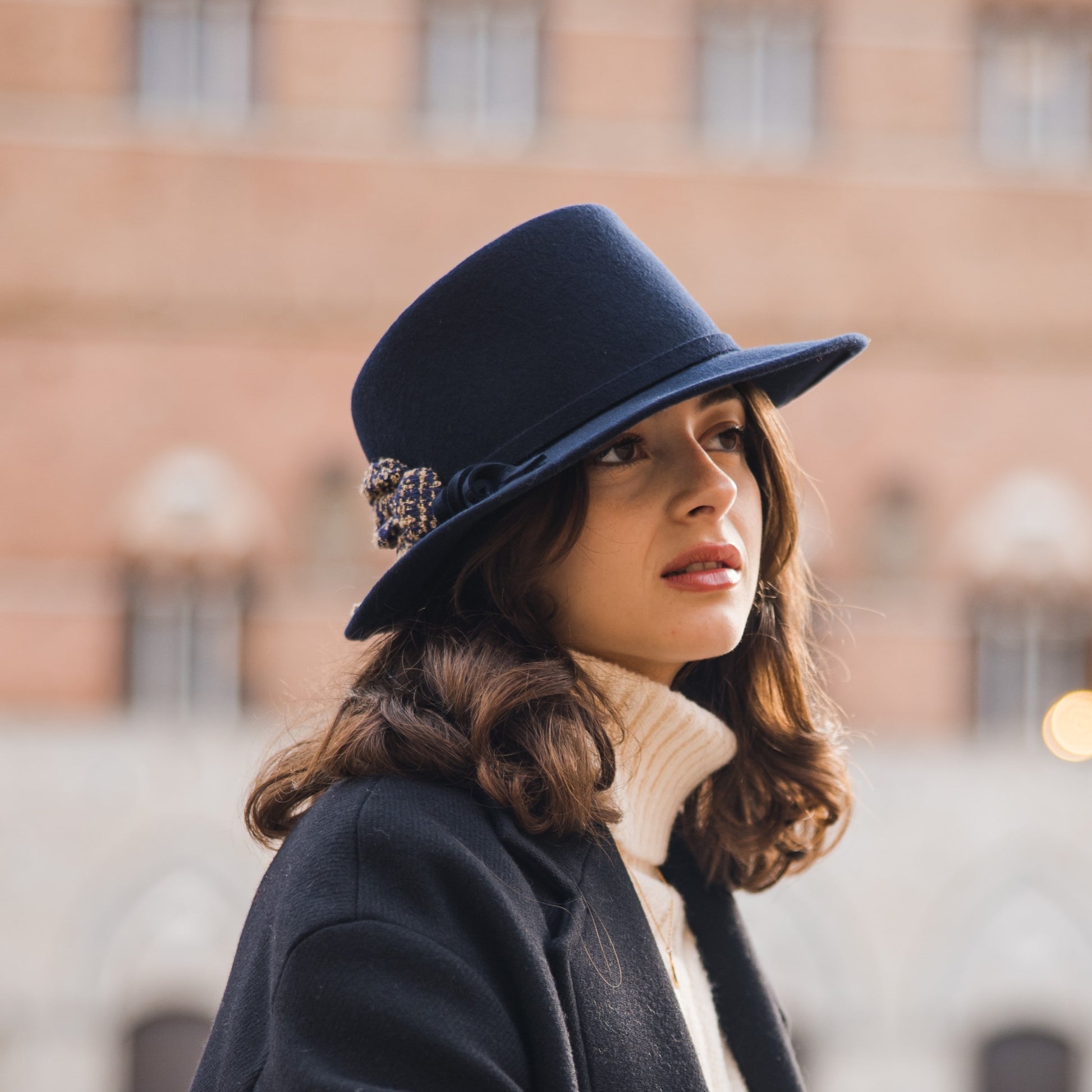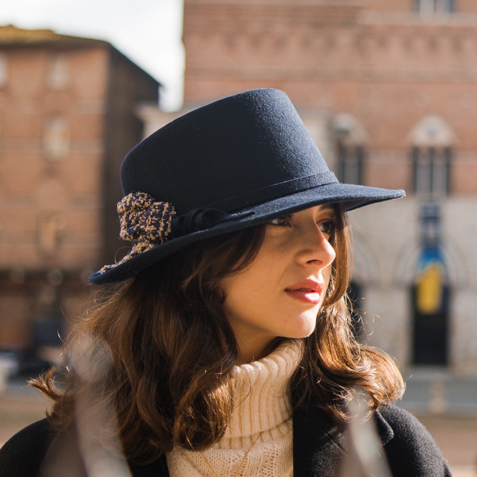 Desgin: Il nostro modello Roby è ispirato al fedora. Lo abbiamo realizzato con una falda media, un doppio laccio in simil pelle che finisce con due piccole borchie in metallo che formano un fiocco aperto a fiore.