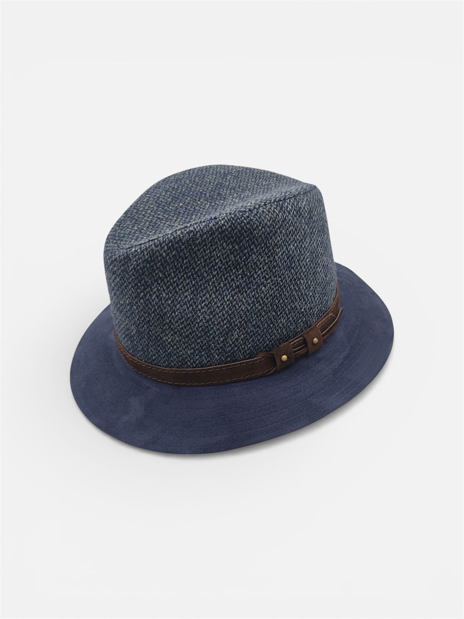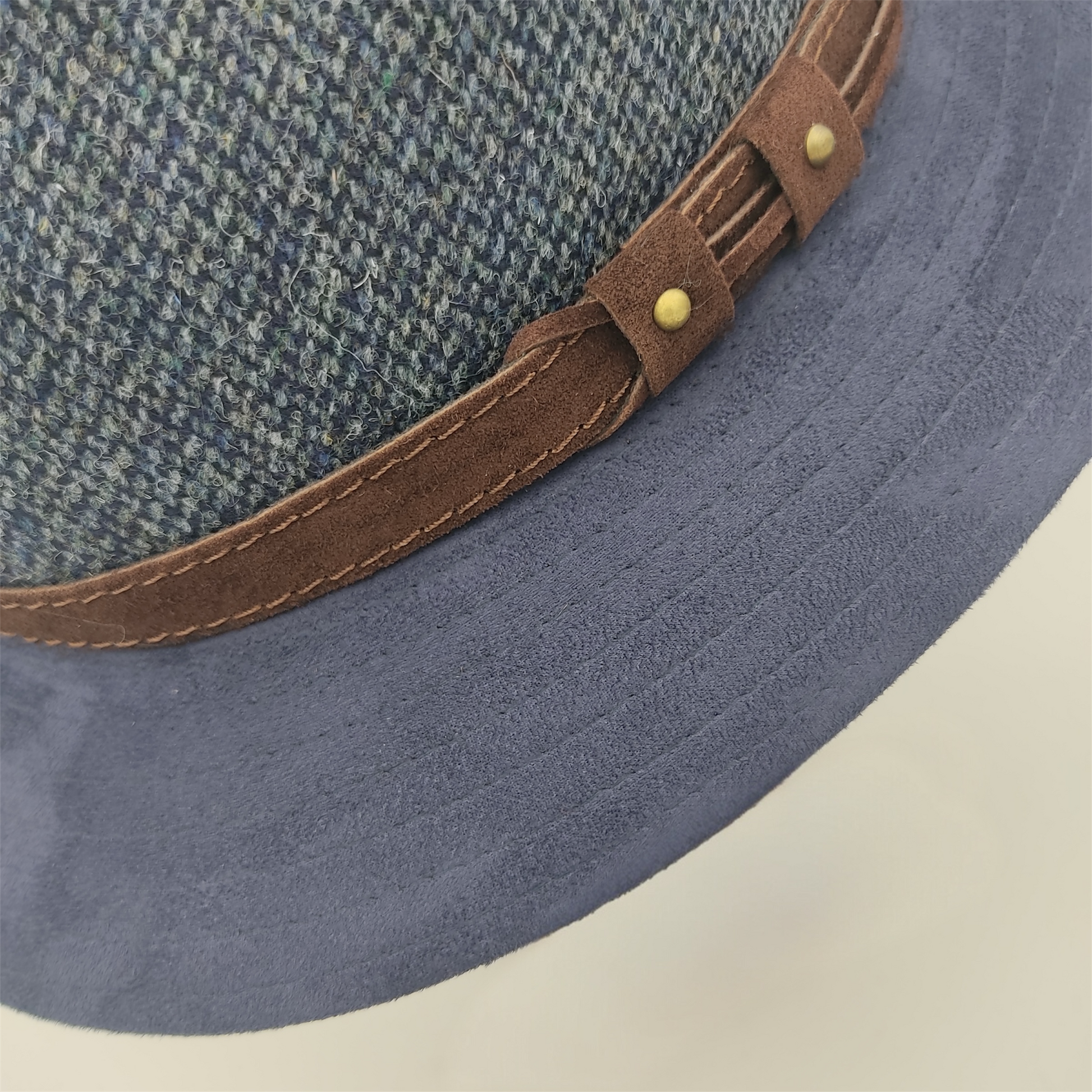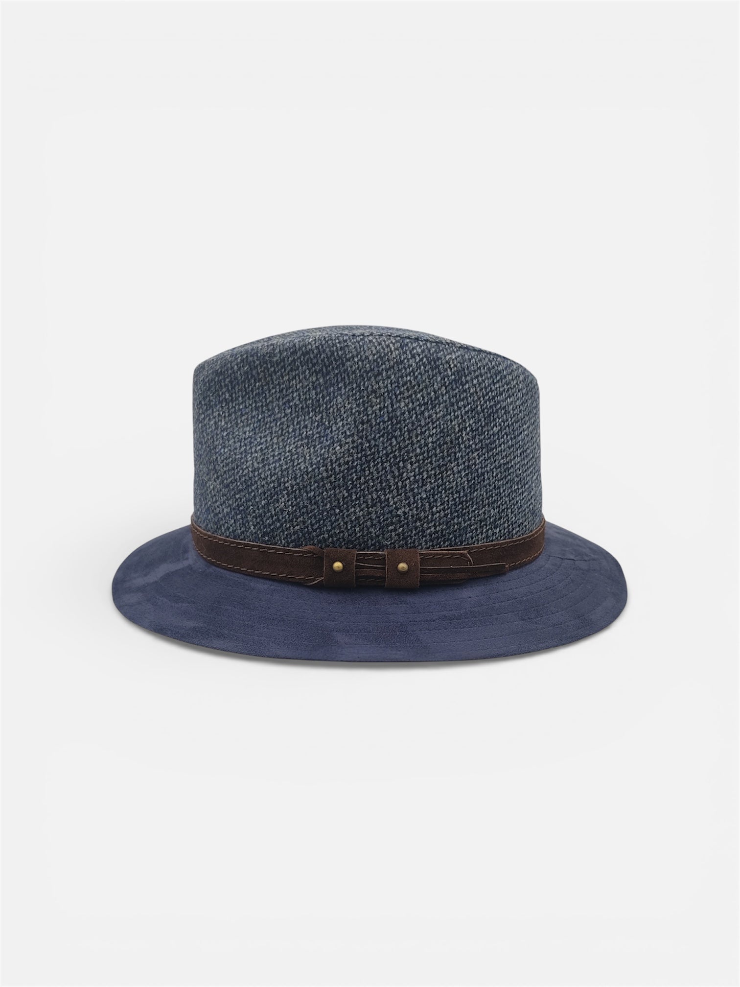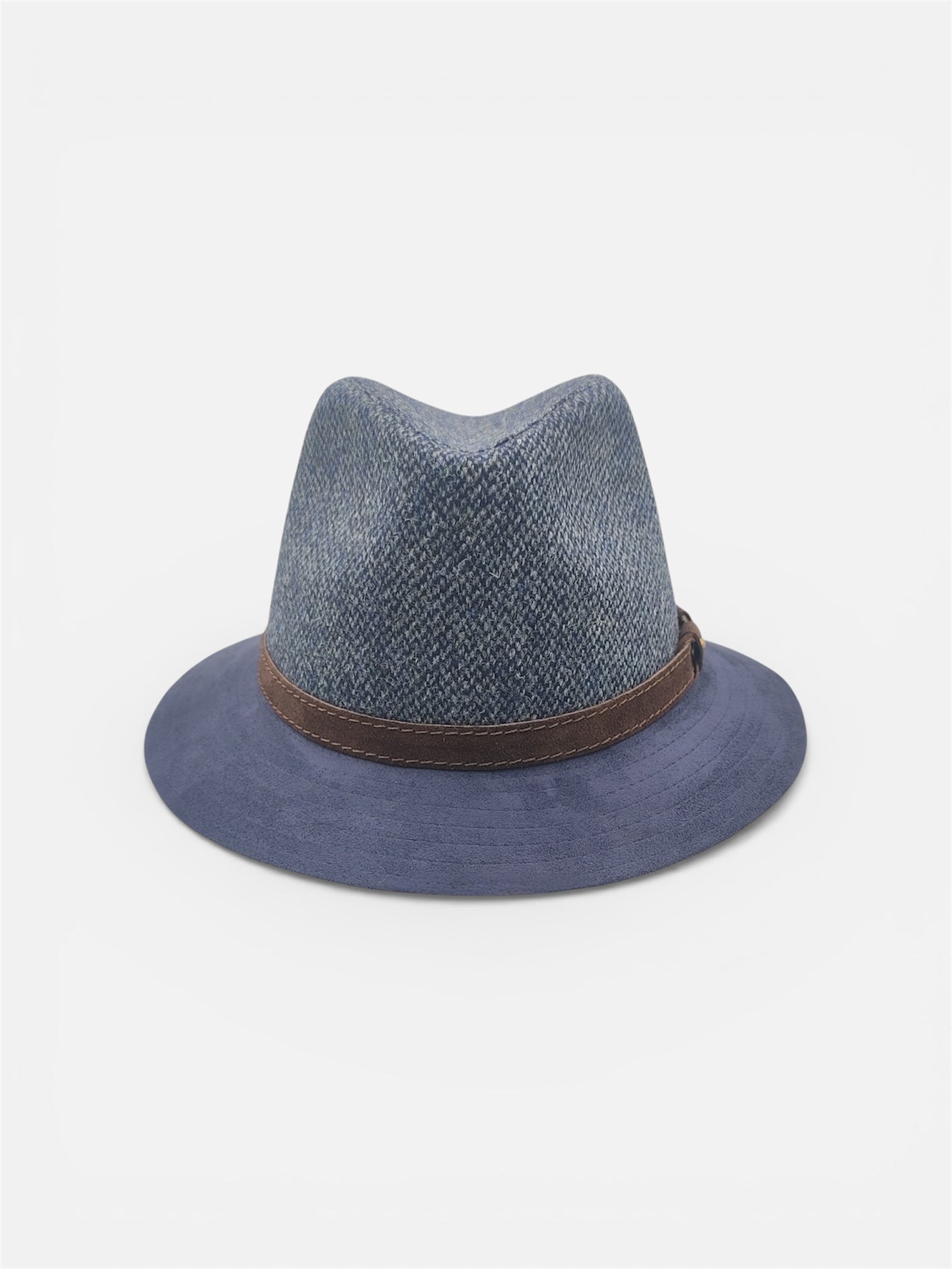 Il design è definito da una corona in pregiato tessuto di lana dalla texture mélange nelle sfumature del blu, abbinata a una tesa in Alcantara® blu tinta unita.