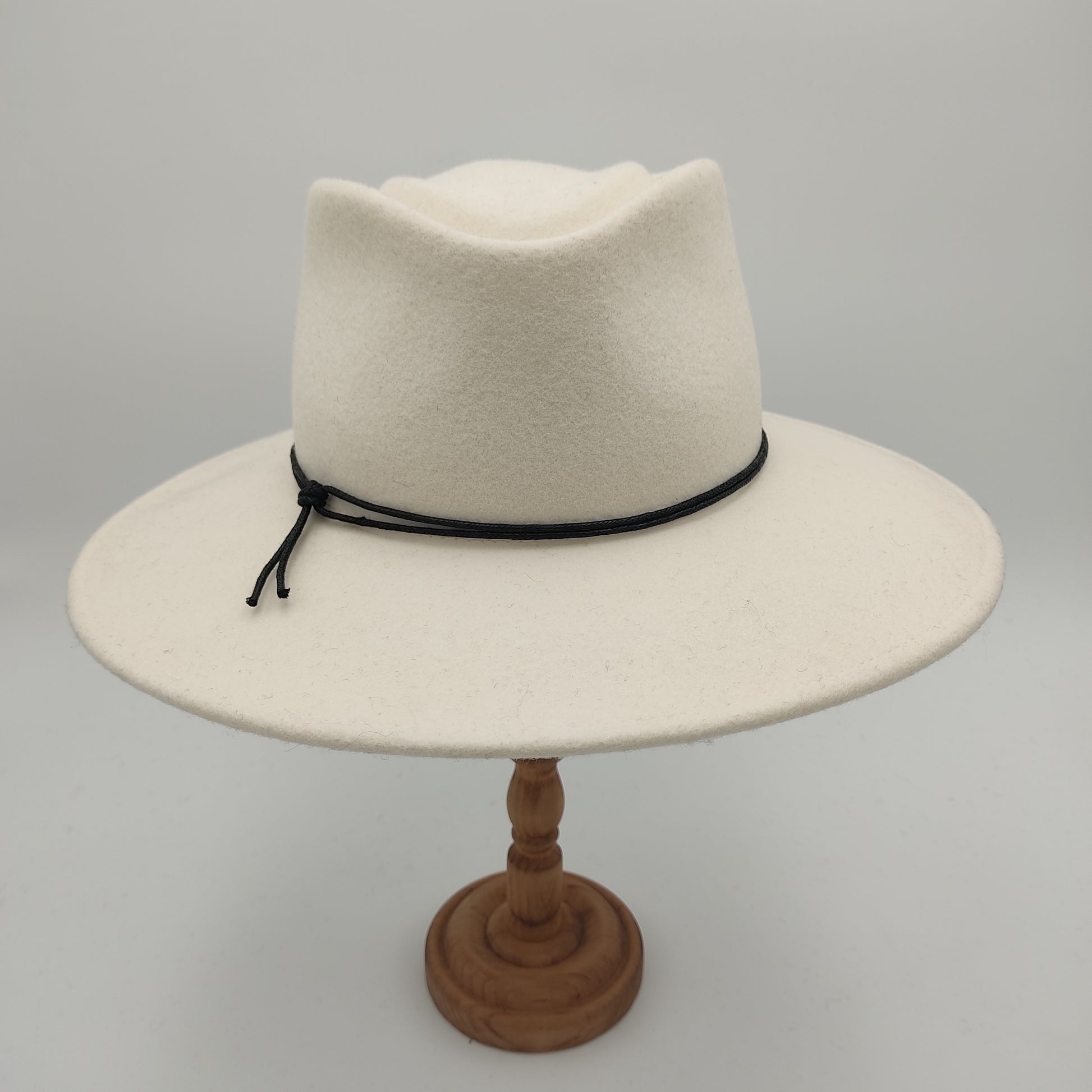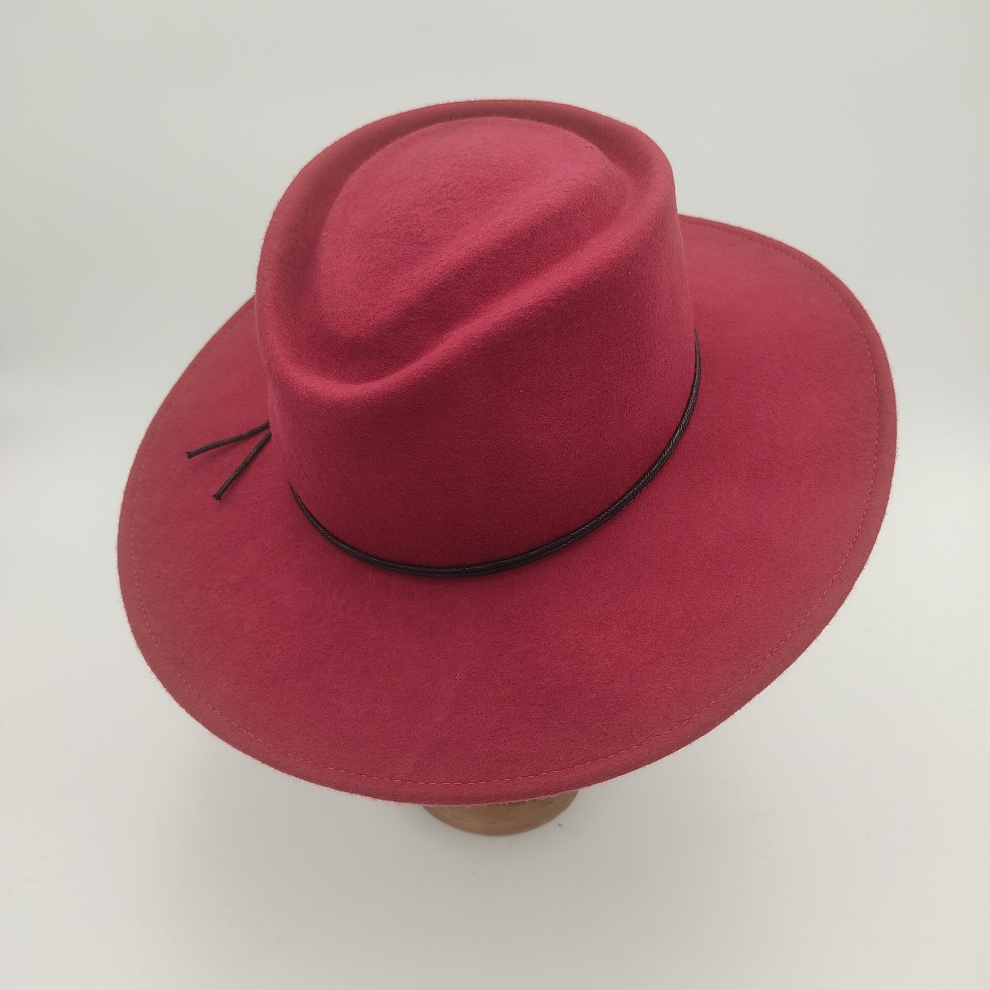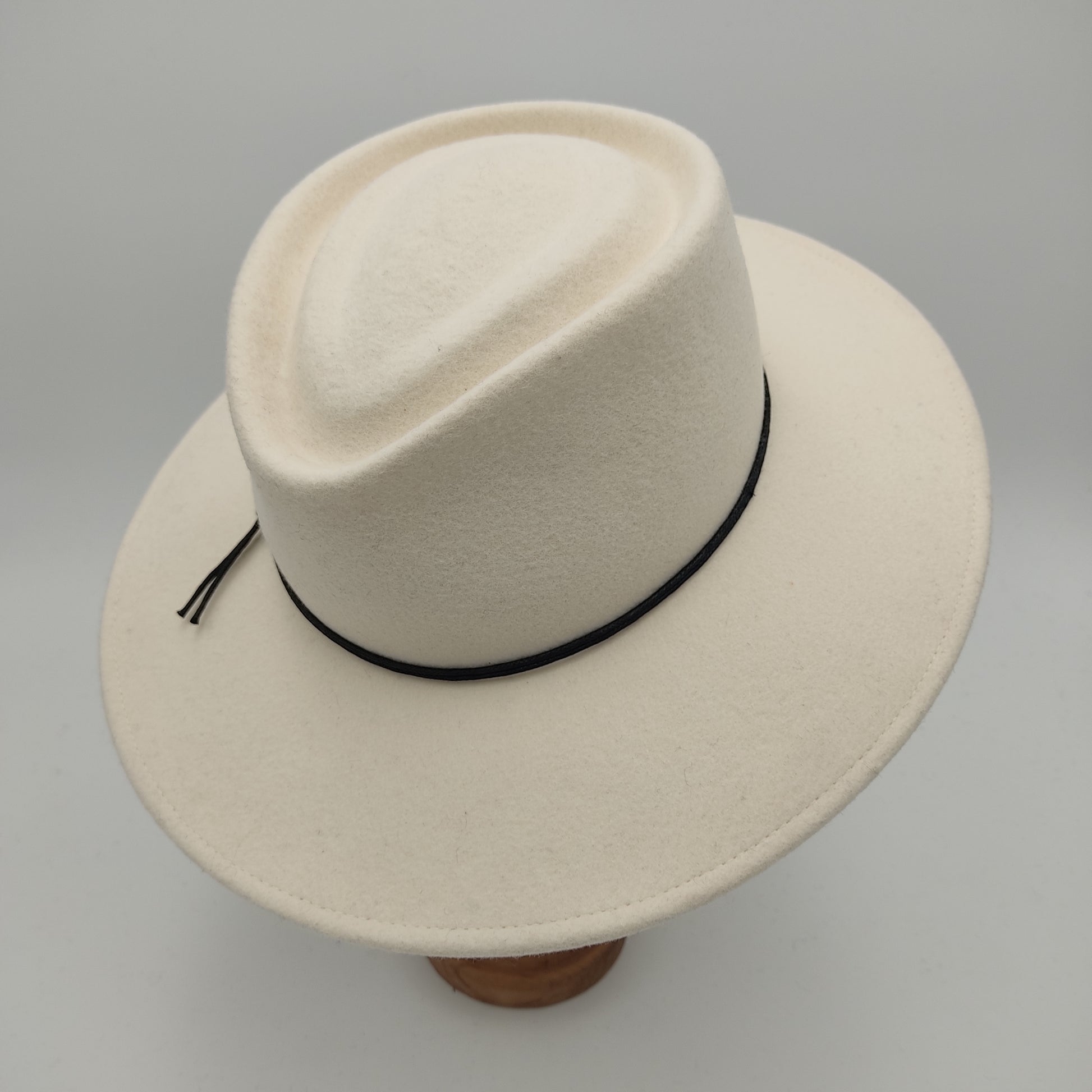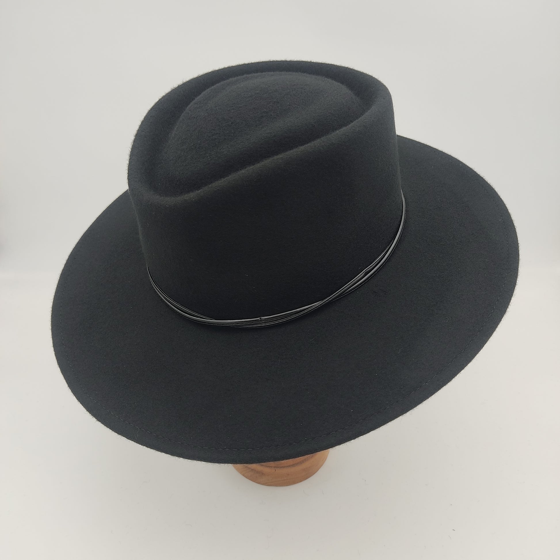 Realizzato in Italia con feltro di lana al 100%, Vanessa vanta una falda ampia di 8,5 cm e la sua testa a goccia, alta 8.5 cm e con una particolare scanalatura decorativa, si adatta perfettamente alla forma del capo.